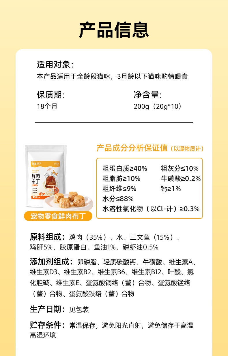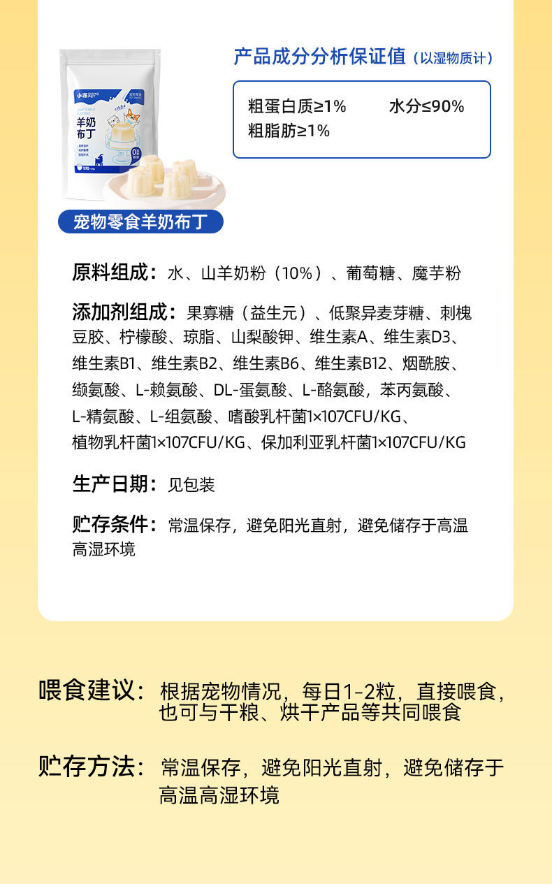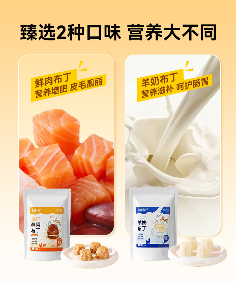 | Sabor | [Pudín de carne fresca] Salmón de pollo 20g * 10 piezas,[Pudín de carne fresca] Sabor mixto 25g * 12 piezas,[Pudín de carne fresca] Yema de huevo de pollo 25g * 12 piezas,[Pudín de carne fresca] Sabor a pollo 25g * 12 piezas,[Pudín de carne fresca] Sabor a salmón 25g * 12 piezas,[Pudín de leche de cabra] yema de huevo 15g * 14 piezas,[Pudín de leche de cabra] Probióticos 15g * 14 cápsulas,[Pudín de leche de cabra] Calcio nutricional 15g * 14 cápsulas,[Pudín de leche de cabra] Leche condensada alcohólica 25g * 14 cápsulas |