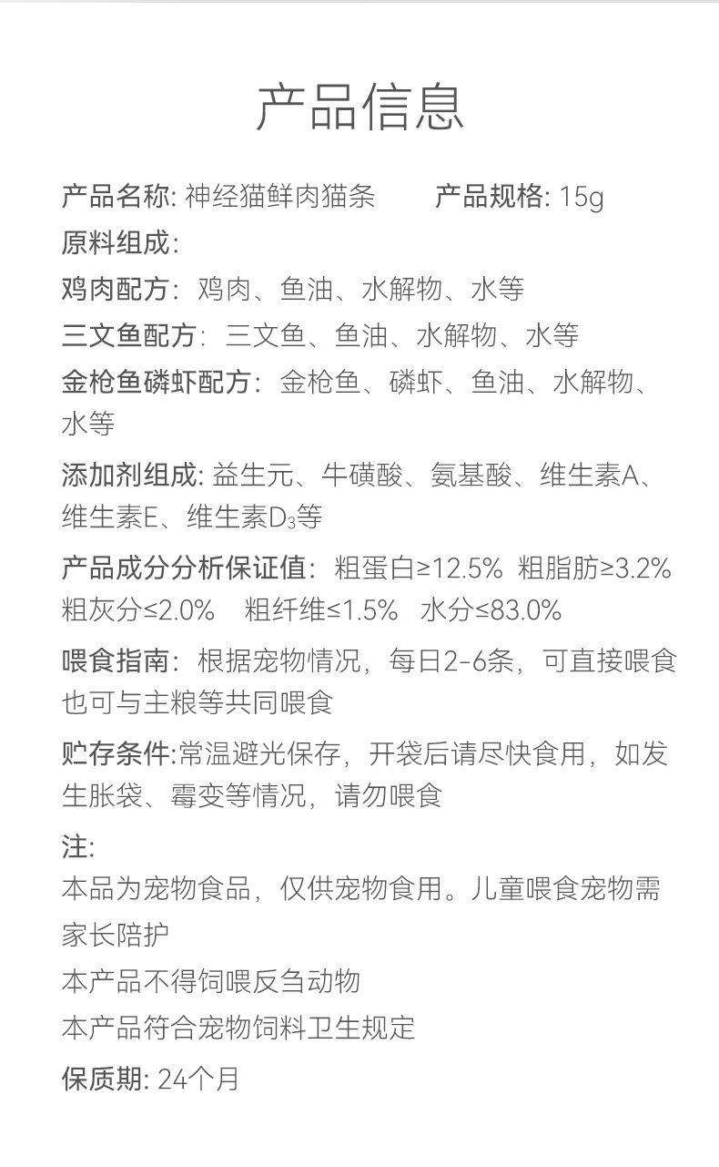 | Sabor | Salmón (90% con carne) [15g],Atún krill (90% de carne) [15g],Pollo (90% con carne) [15g] |
