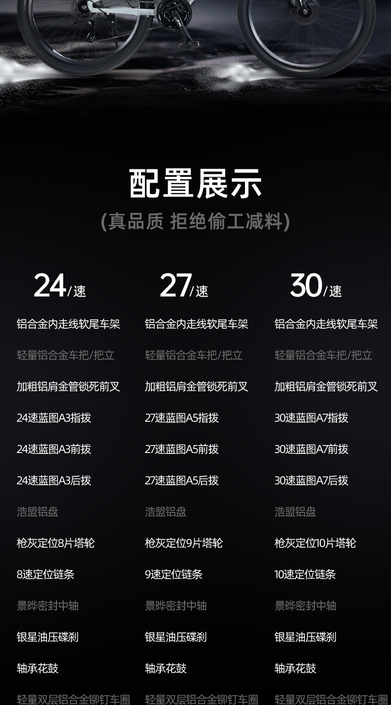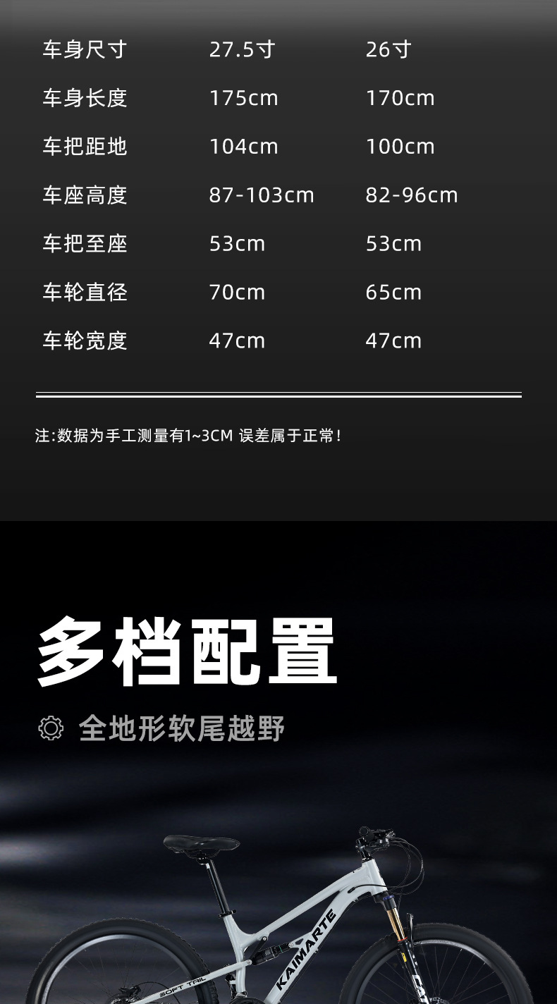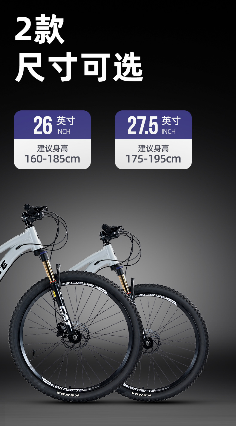 | Tamaño | 26 pulgadas-24 velocidades (adecuado para más de 160),26 pulgadas-27 velocidades (adecuado para más de 160),26 pulgadas-30 velocidades (adecuado para más de 160),27,5 pulgadas-24 velocidades (adecuado para más de 175),27,5 pulgadas-27 velocidades (adecuado para más de 175),27,5 pulgadas-30 velocidades (adecuado para más de 175) |