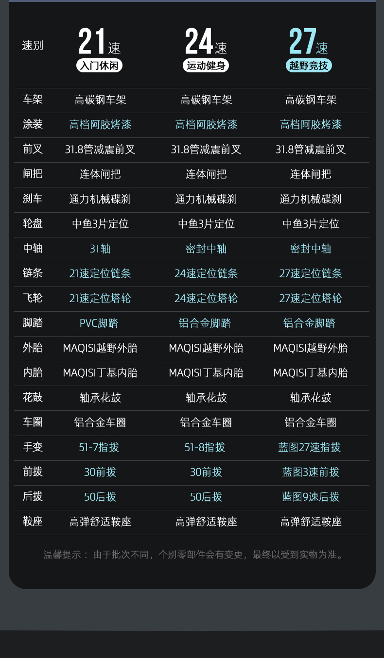 | Tamaño | 29 pulgadas 21, 29 pulgadas 24, 29 pulgadas 27, 29 pulgadas 30, 27,5 pulgadas 21, 27,5 pulgadas 24, 27,5 pulgadas 27, 27,5 pulgadas 30 |