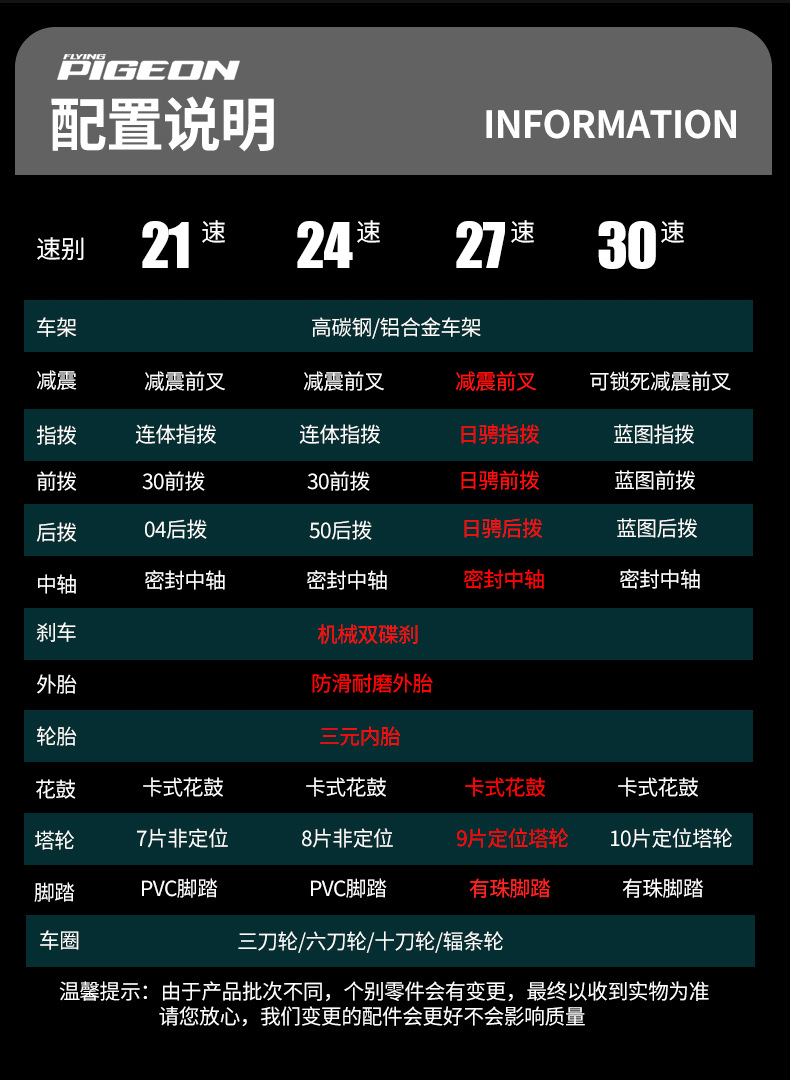 | Tamaño | 24 pulgadas-21 velocidades,26 pulgadas-21 velocidades,27,5 pulgadas-21 velocidades,24 pulgadas-24 velocidades,26 pulgadas-24 velocidades,27,5 pulgadas-24 velocidades,24 pulgadas-27 velocidades,26 pulgadas-27 velocidades,27,5 pulgadas-27 velocidades,24 pulgadas-30 velocidades,26 pulgadas-30 velocidades,27,5 pulgadas-30 velocidades |