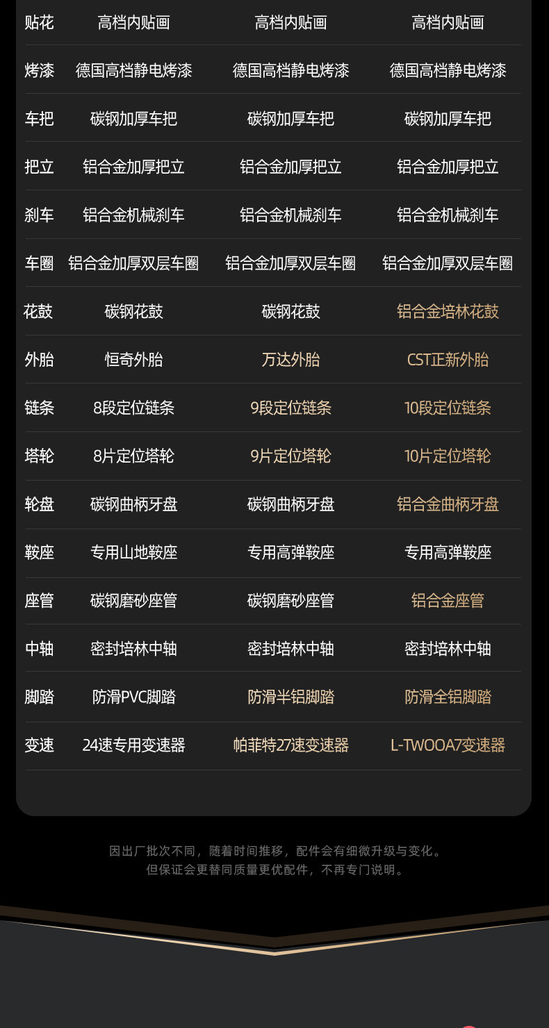 | Tamaño | 24 pulgadas 24 velocidades,26 pulgadas 24 velocidades,24 pulgadas 27 velocidades,26 pulgadas 27 velocidades,24 pulgadas 30 velocidades,26 pulgadas 30 velocidades |