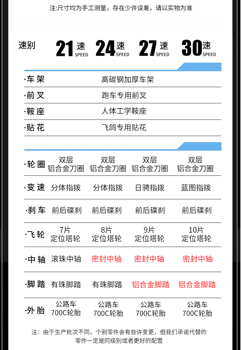 | Tamaño | 700C-21 velocidad,700C-24 velocidad,700C-27 de velocidad,700C-30 velocidades |