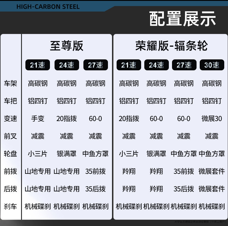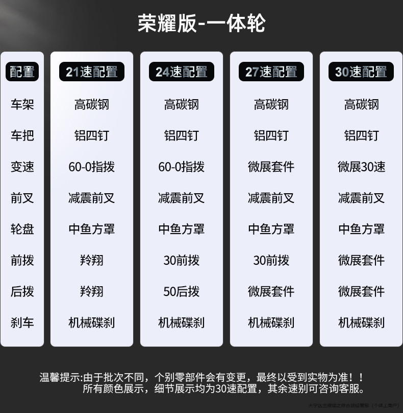 | Tamaño | 21 velocidades 24 pulgadas,21 velocidades 26 pulgadas,24 velocidades 24 pulgadas,24 velocidades 26 pulgadas,27 velocidades 24 pulgadas,27 velocidades 26 pulgadas,30 velocidades 24 pulgadas,30 velocidades 26 pulgadas |