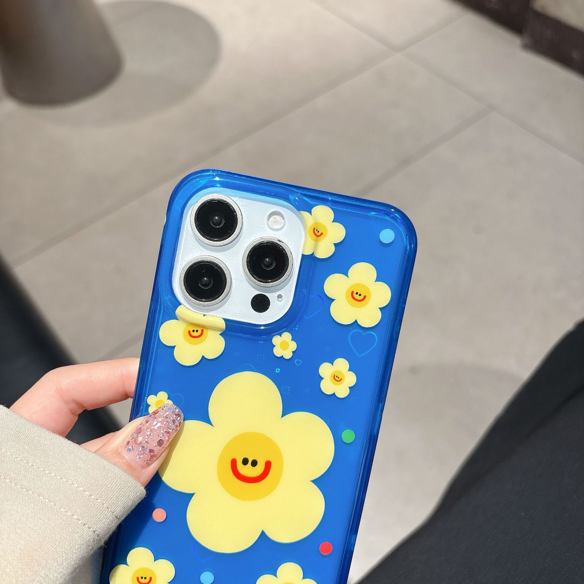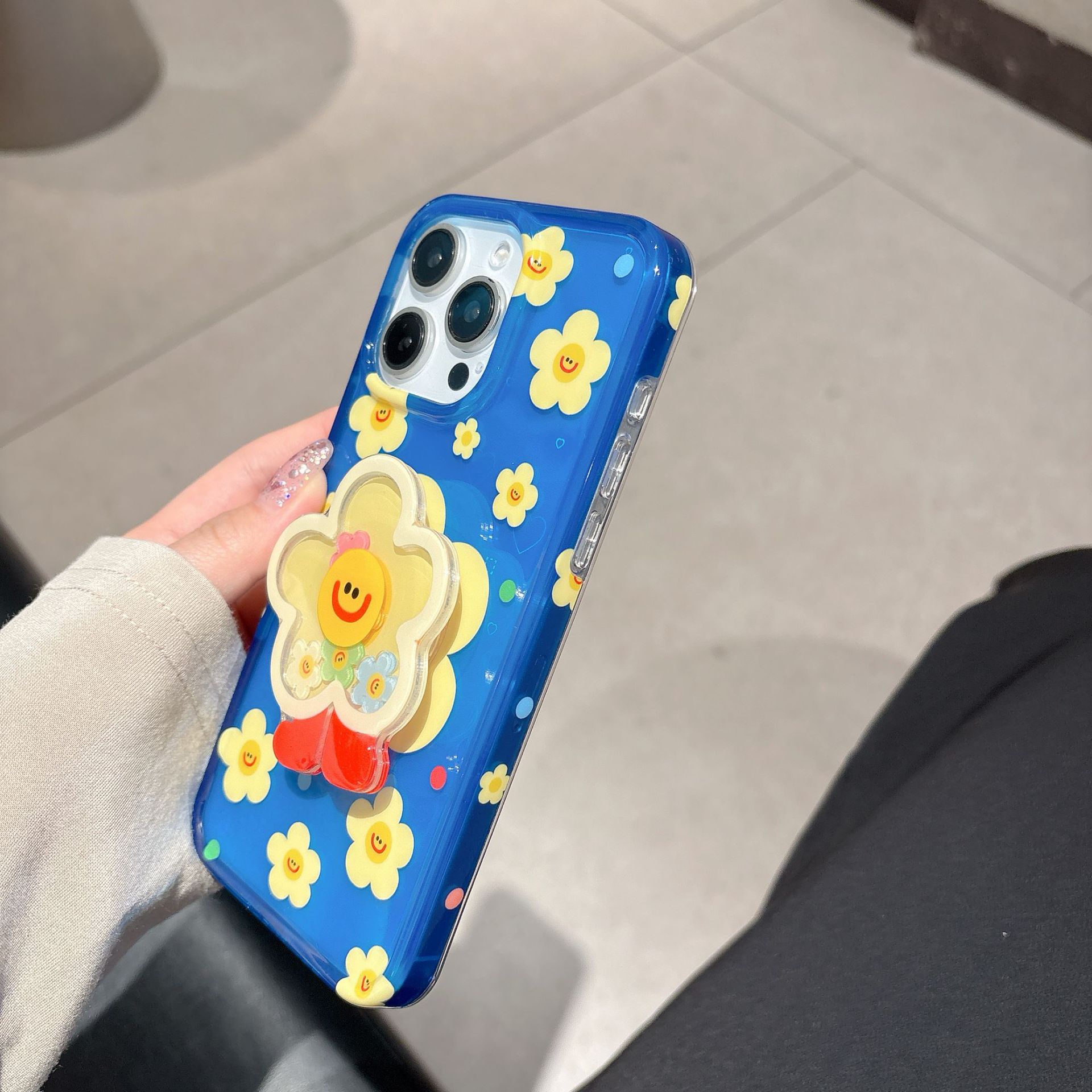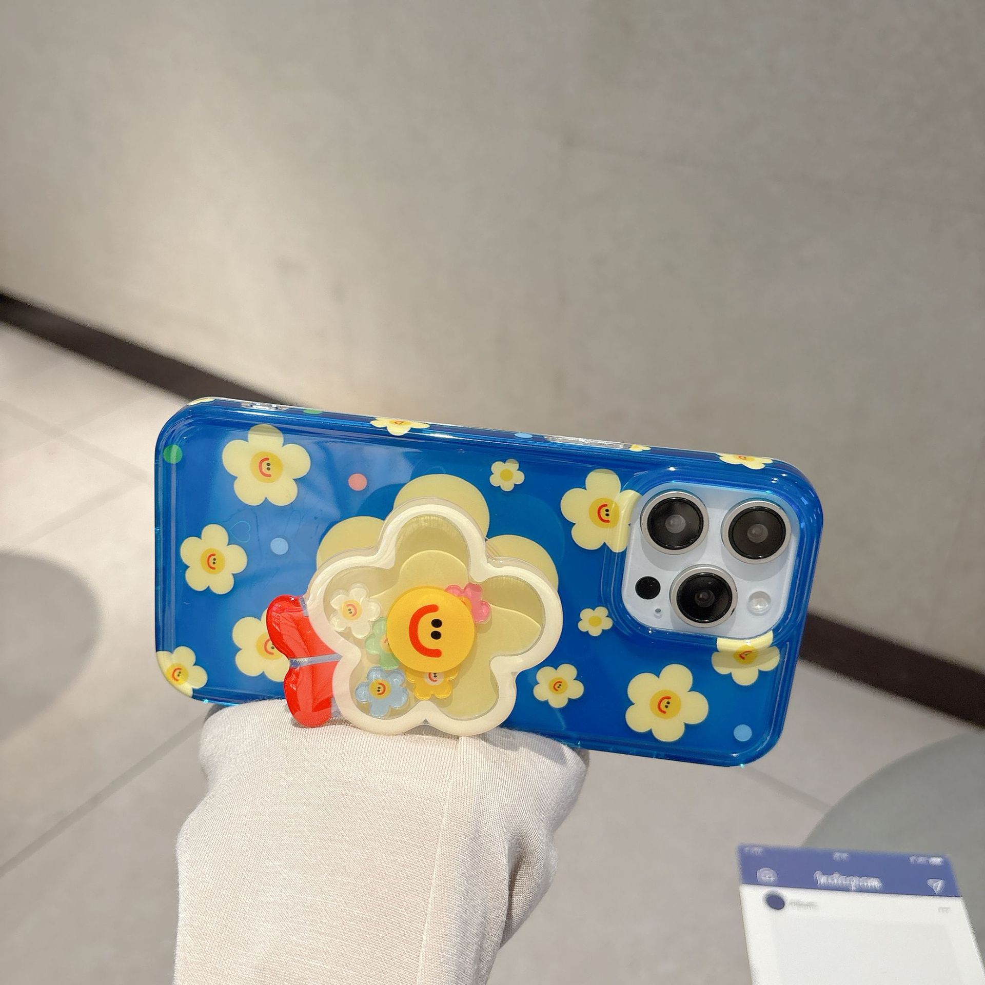 Capa única-fondo azul pantalla completa amarillo cara sonriente flor NK,Soporte fondo azul pantalla completa amarillo cara sonriente flor NK