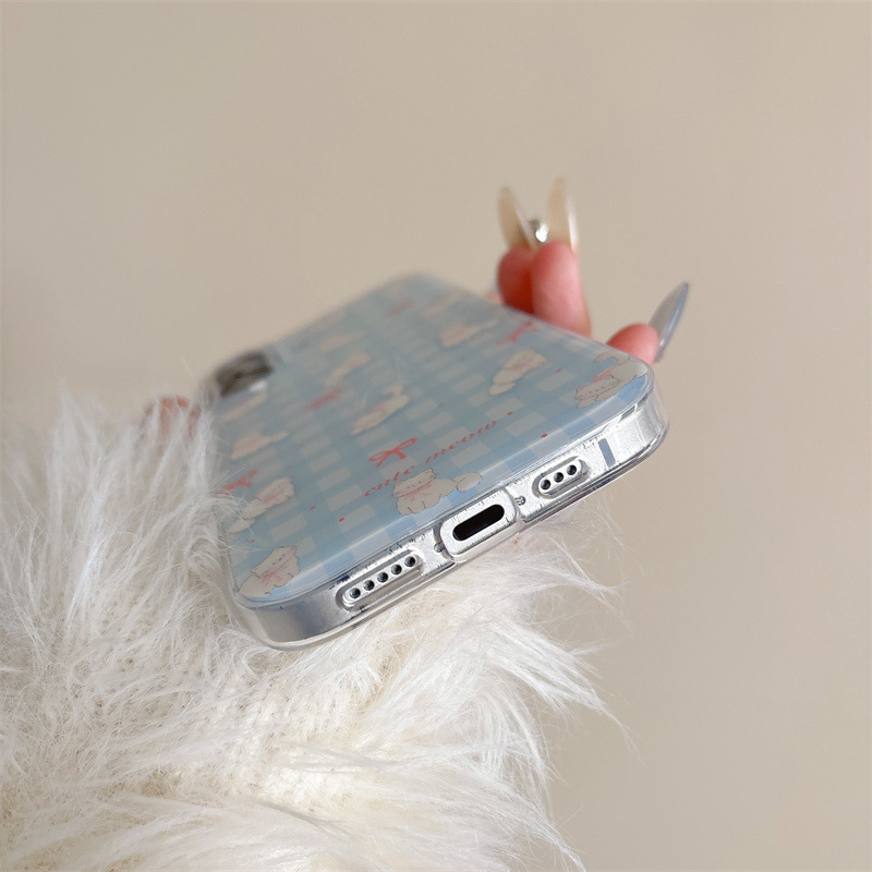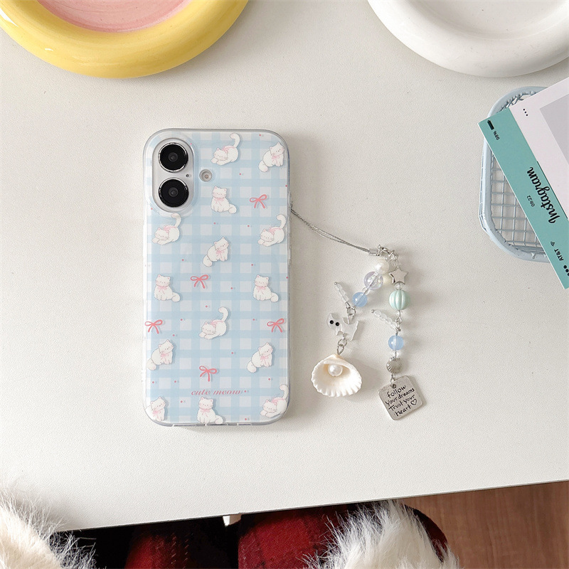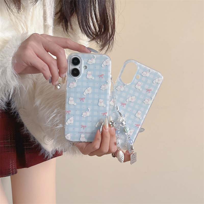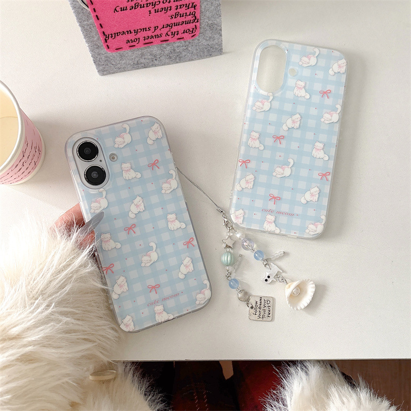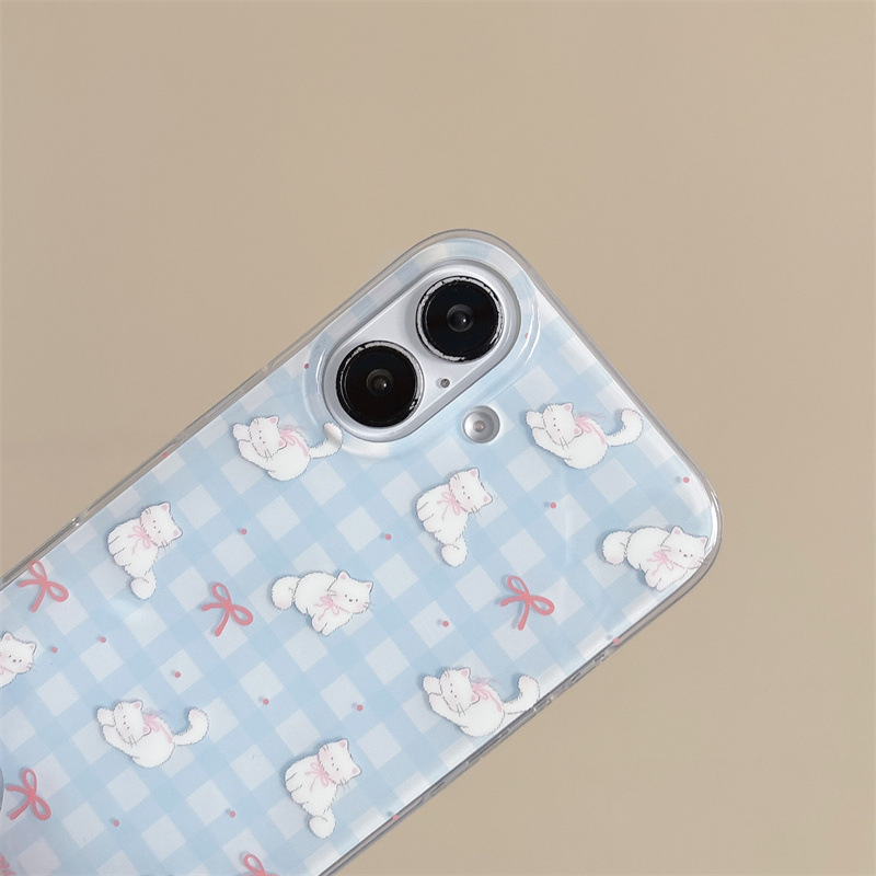 Pequeño gato con lazo a cuadros azul fresco para iphone16ProMax Apple 15 funda para teléfono móvil 14 femenino 13 nuevo
