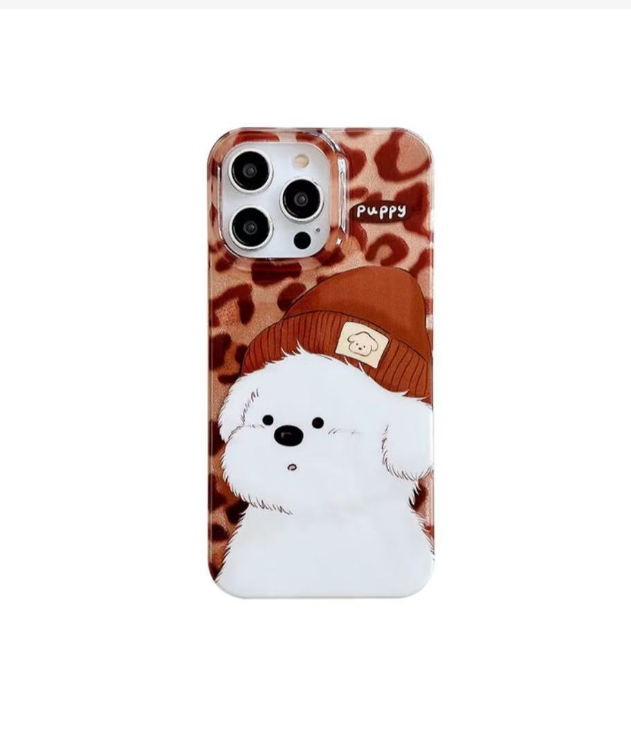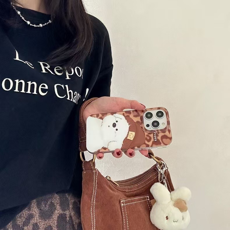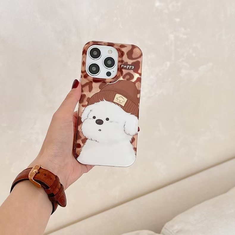 Lindo sombrero pequeño perro blanco iPhone16promax estampado de leopardo marrón Apple 15pro funda para teléfono 14/13 nuevo