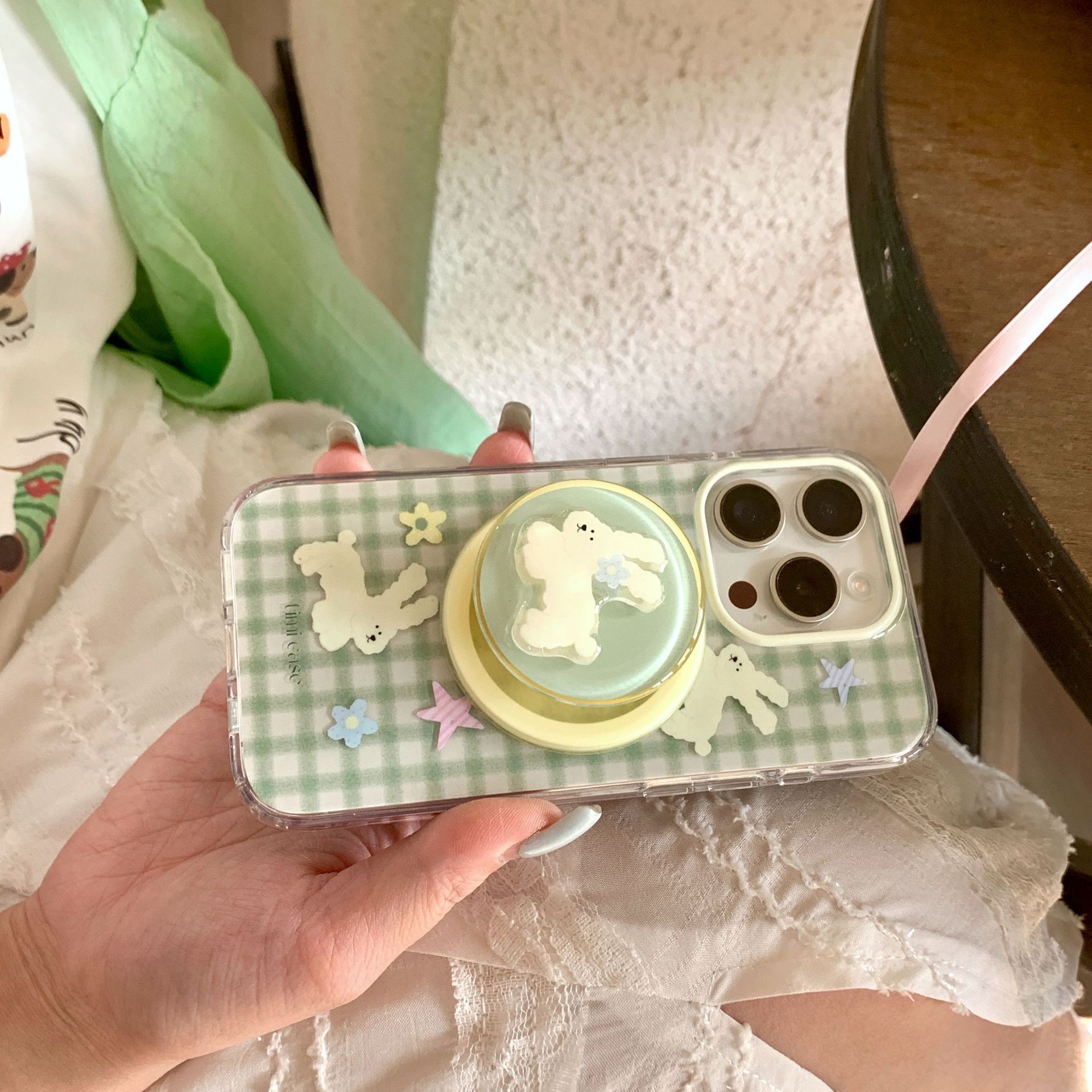 Conejo de costura de cuadros verde coreano para Apple 16Pro funda para teléfono móvil 15ProMax magnético 14 nuevo 16PM