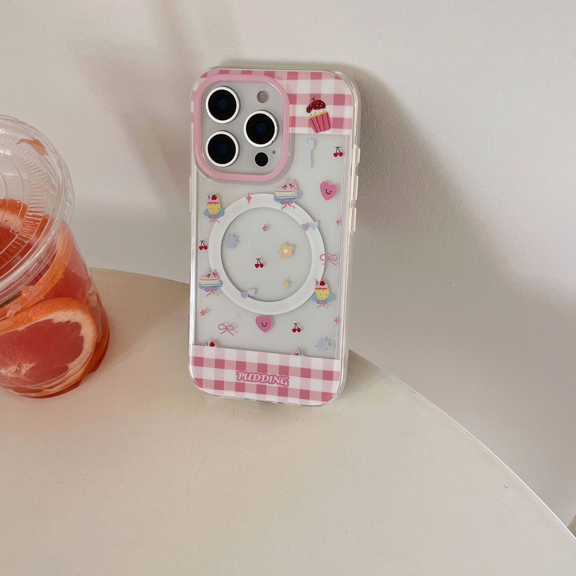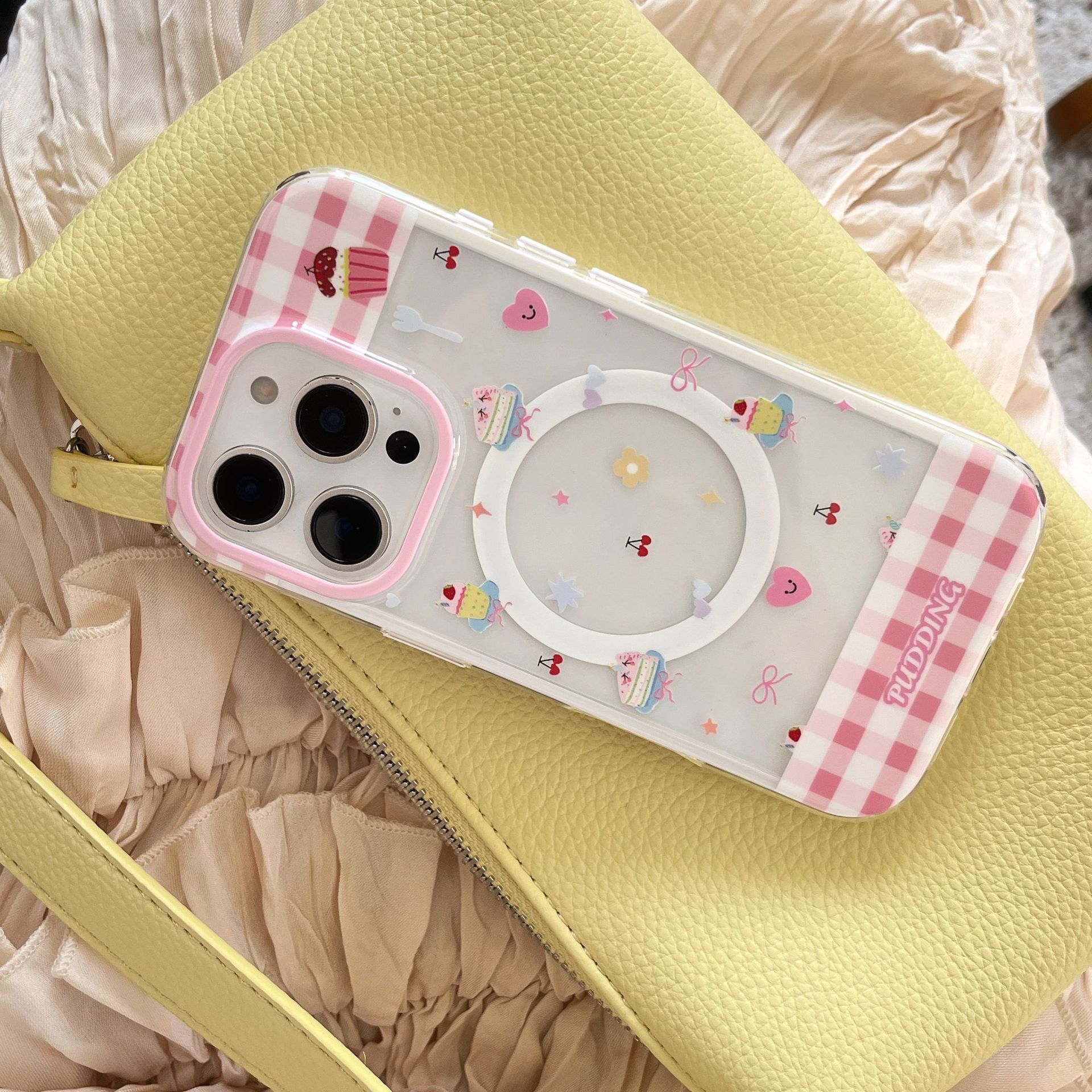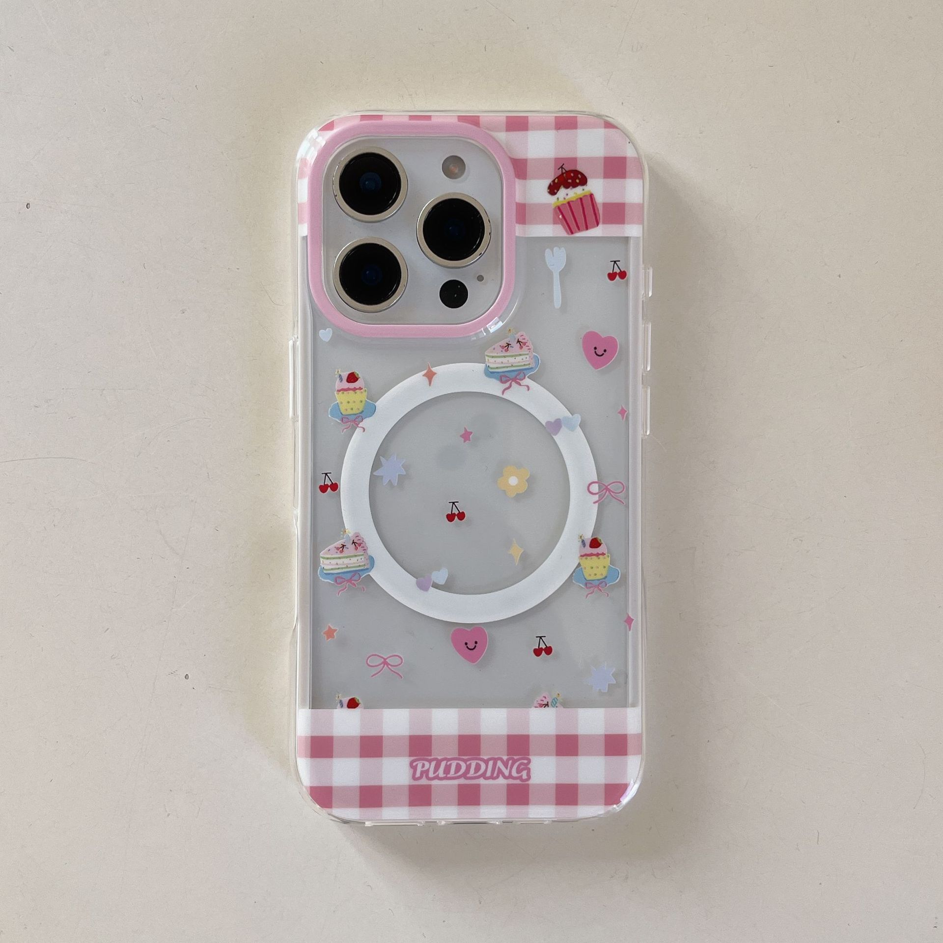 Postre de costura de cuadros en polvo de dibujos animados para Apple 16ProMax funda para teléfono móvil 15Pro transparente 14/13 magnético 16