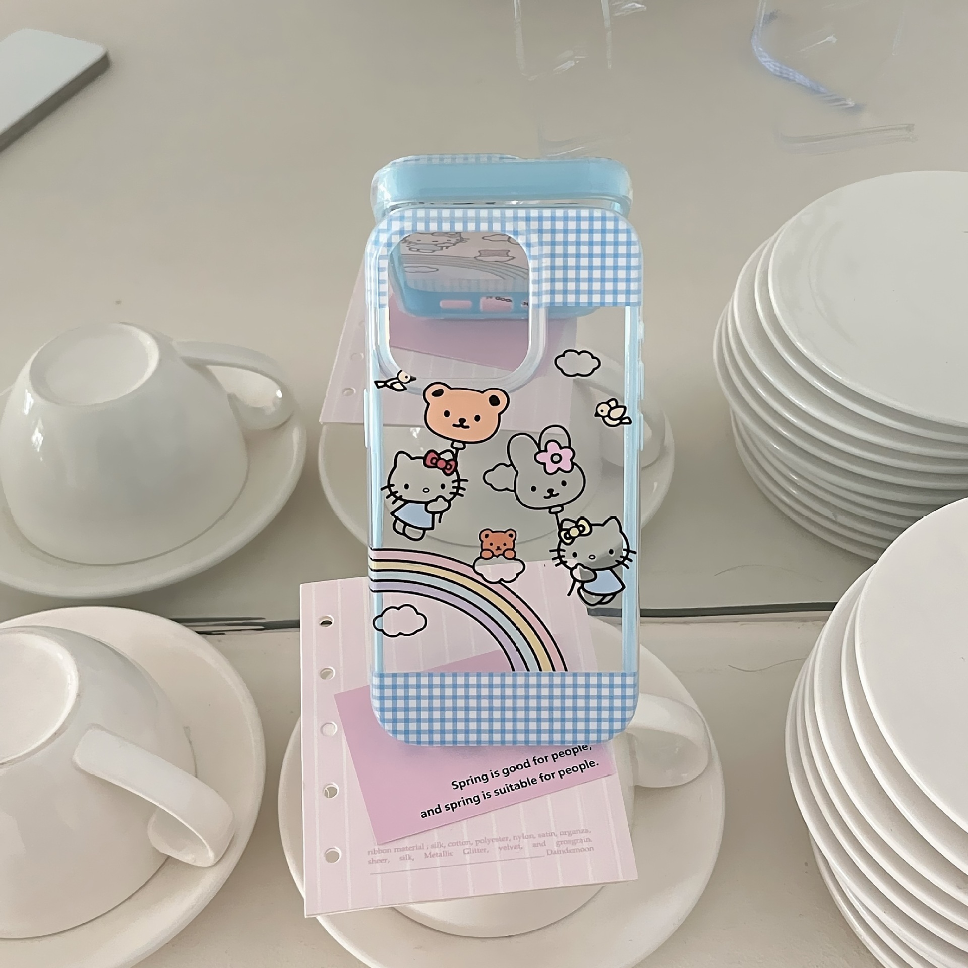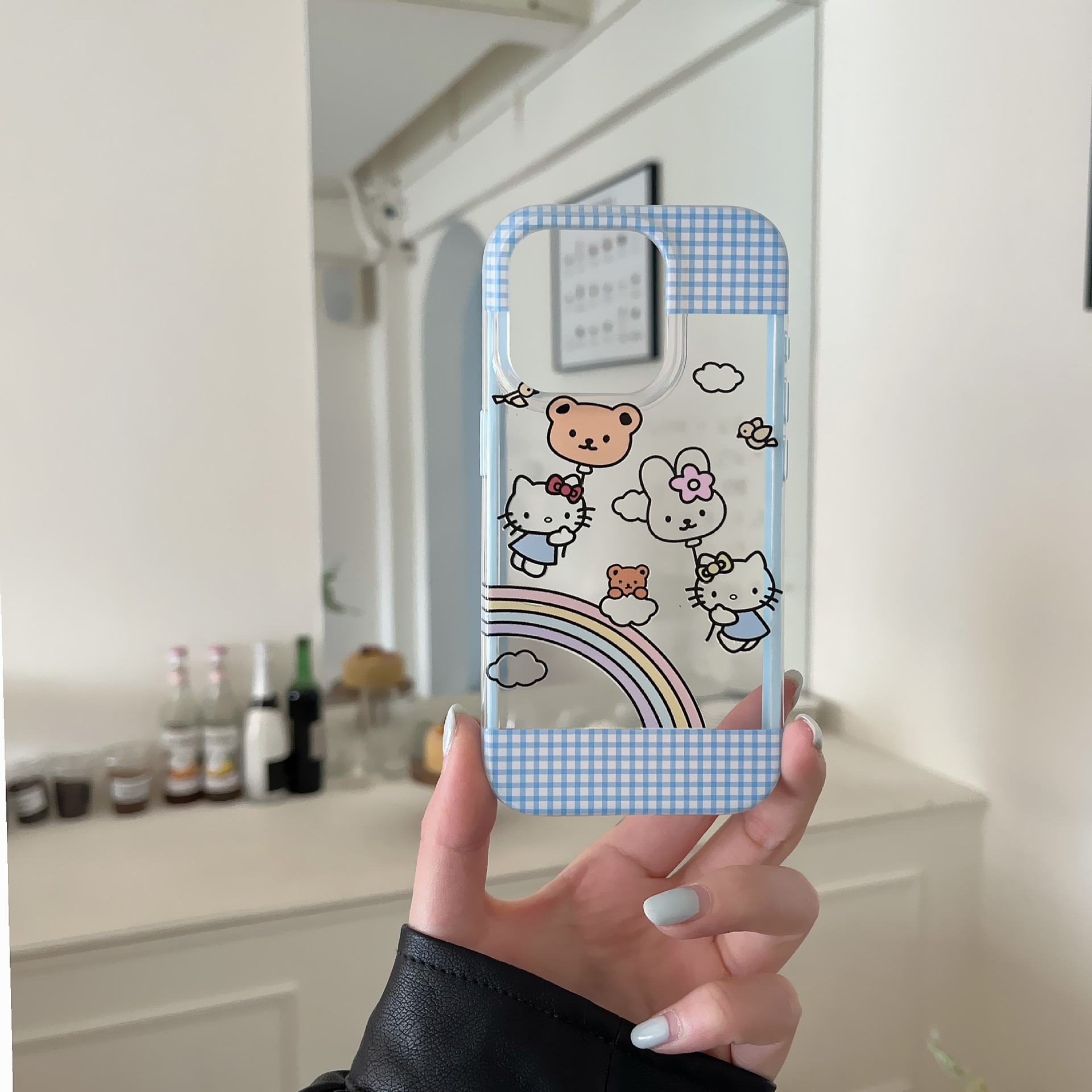 Pequeño gato KT arco iris a cuadros azul fresco para Apple 16ProMax funda para teléfono móvil 15/14 pareja nuevo 15P