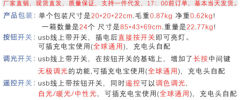 | Potencia de la fuente de luz | 5V USB interruptor de una marcha,5V USB de tres colores con atenuación de múltiples archivos,5V USB tres colores control remoto atenuación temporizador apagado luz,220V en línea tres colores LED de cambio de luz,Enchufe recto estándar estadounidense (tres colores) cambio de luz de tres velocidades,Enchufe recto estándar europeo (tres colores) cambio de luz de tres velocidades,Enchufe recto británico (tres colores) cambio de luz de tres velocidades |