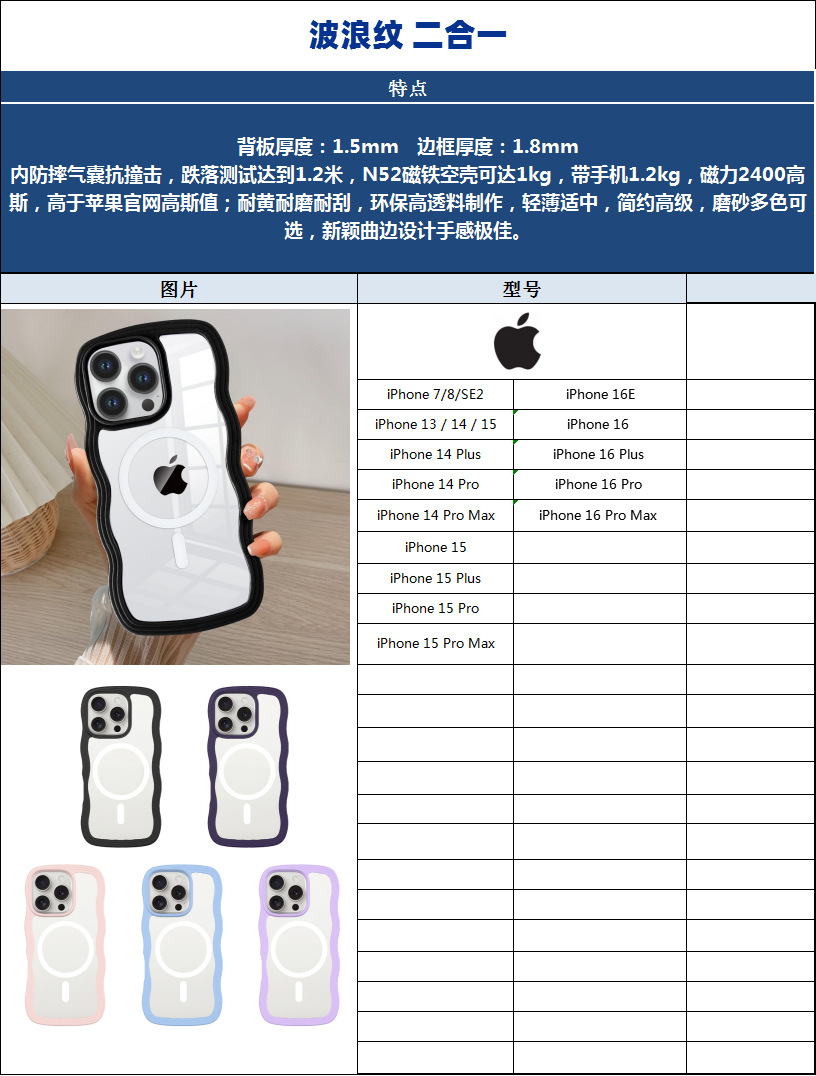 | Modelo aplicable | iphone16 E,iphone16,iphone16 Pro,iphone16 Plus,iphone16 Pro max,iphone15/14/13,iphone15 Pro,iphone15 Plus,iphone15 Pro max,iphone14 Pro,iphone14 Plus,iphone14 Pro max,iphone12/12 pro,iphone 7g/8g/se2/se3 Apple |