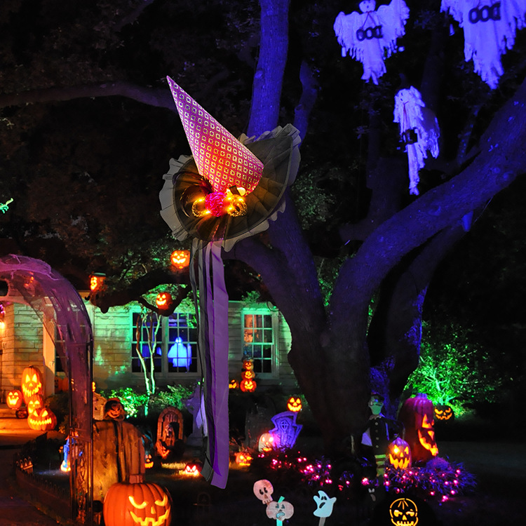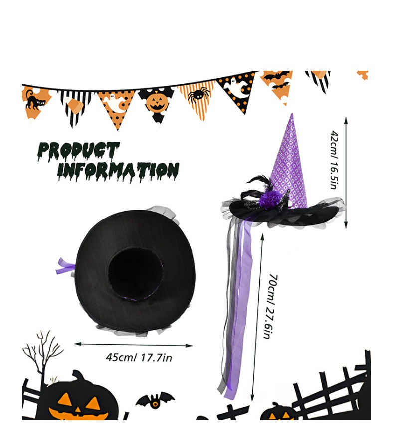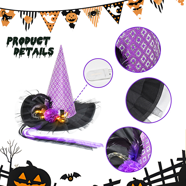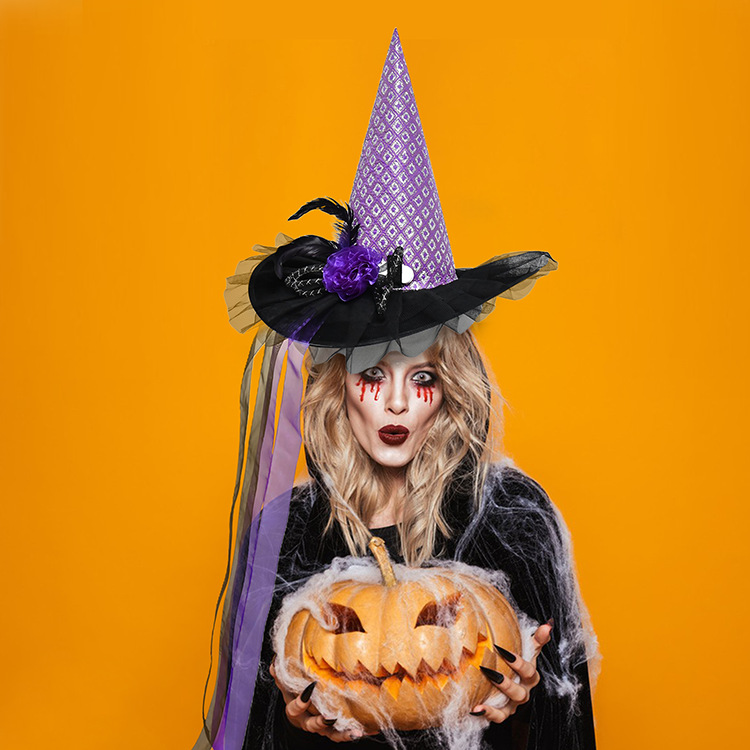 Nuevo sombrero de bruja de Halloween transfronterizo, sombrero de bruja morado negro, mascarada luminosa naranja, vestido de fiesta