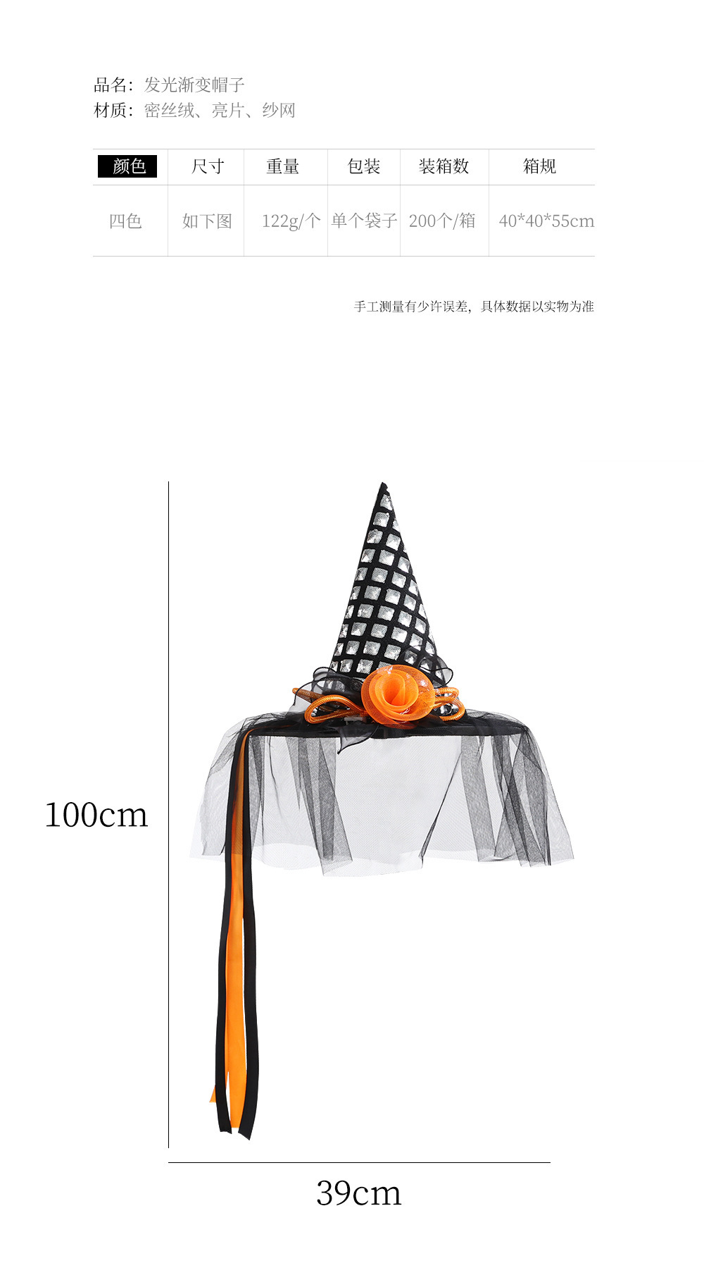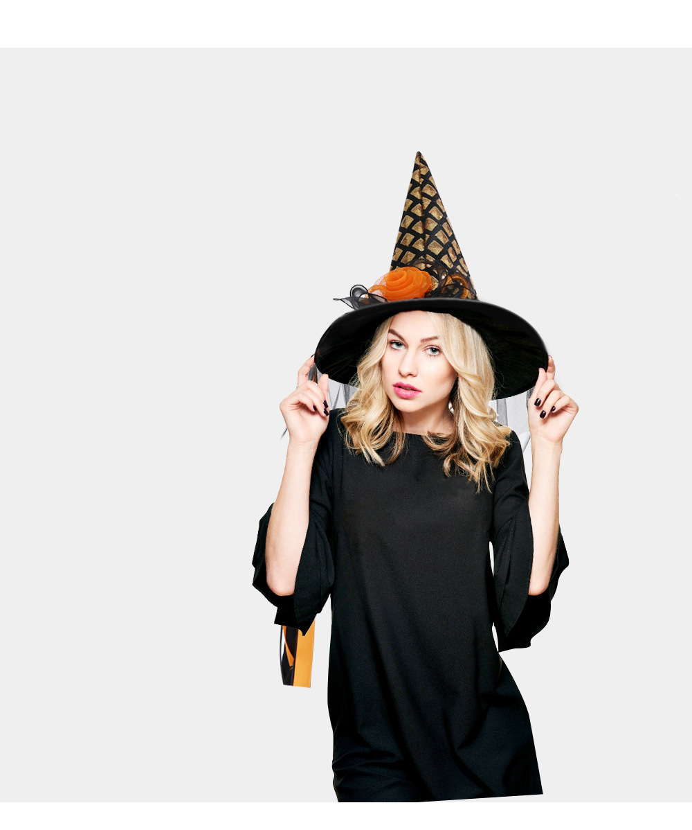 | Colores | Sombrero de bruja brillante dorado,Sombrero de bruja brillante plateado,Sombrero de bruja luminoso gradiente azul lago,Sombrero de bruja luminosa gradiente de oro rosa,Sombrero colgante de esponja de encaje a rayas plateadas |