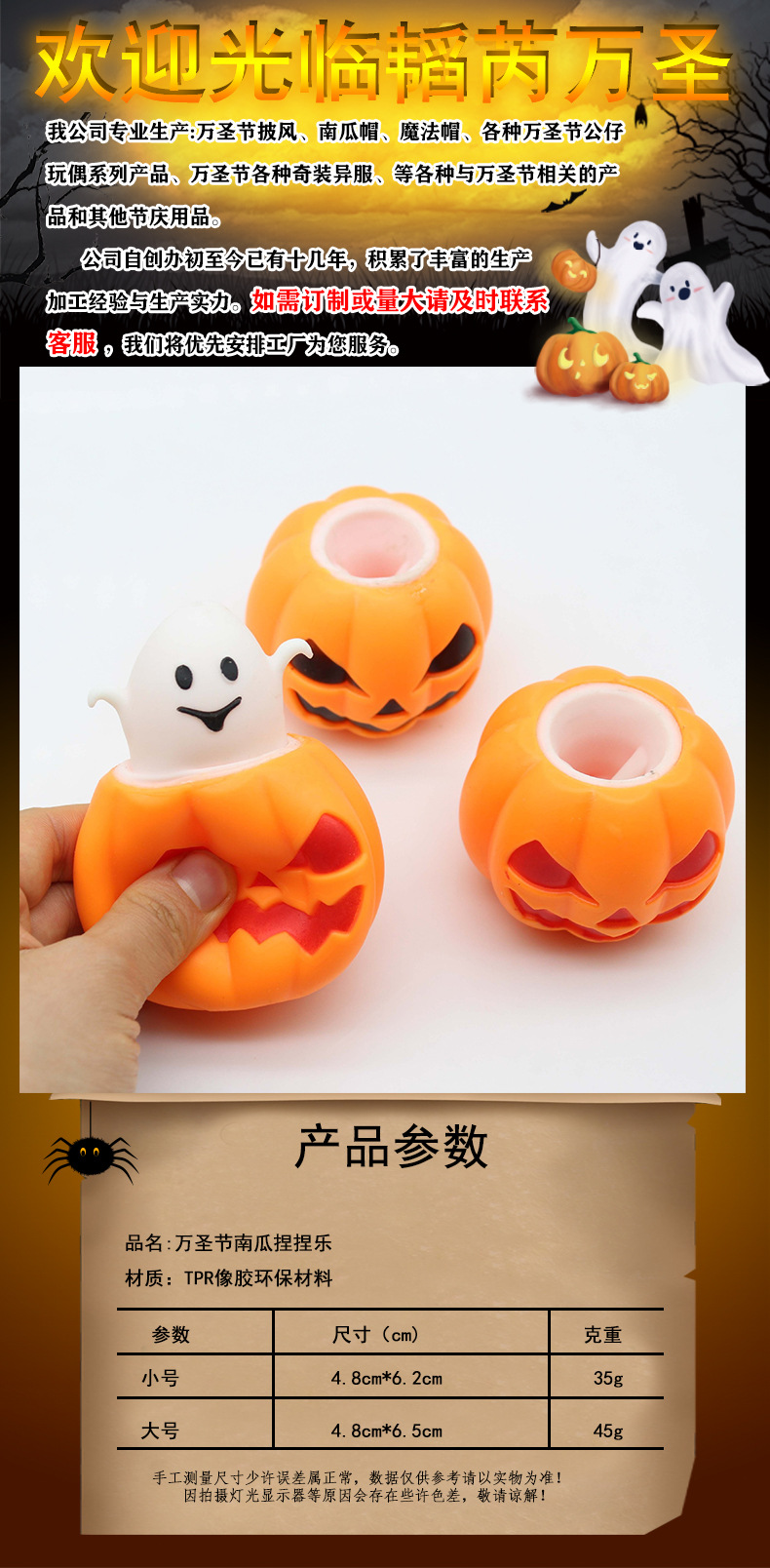 | Color | Trompeta 4,8 * 6,2 cm 35 g, talla grande 4,8 * 6,5 cm 45 g, fantasma de calabaza de Halloween con luz |