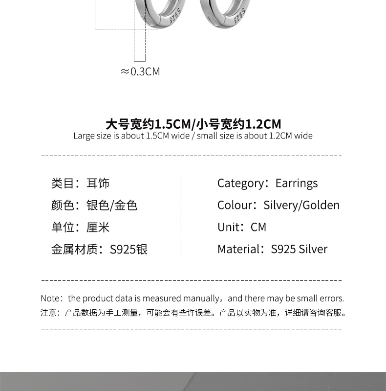 | Color | S925 plata pequeña plata 1.2CM, S925 plata pequeña plata oro 1.2CM, S925 plata grande plata 1.5CM, S925 plata grande oro 1.5CM |
