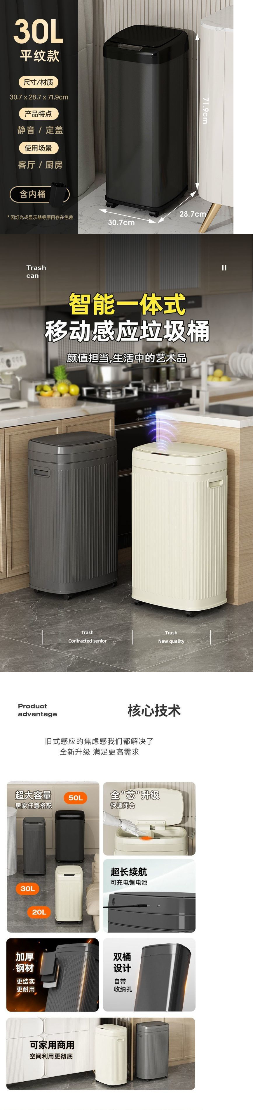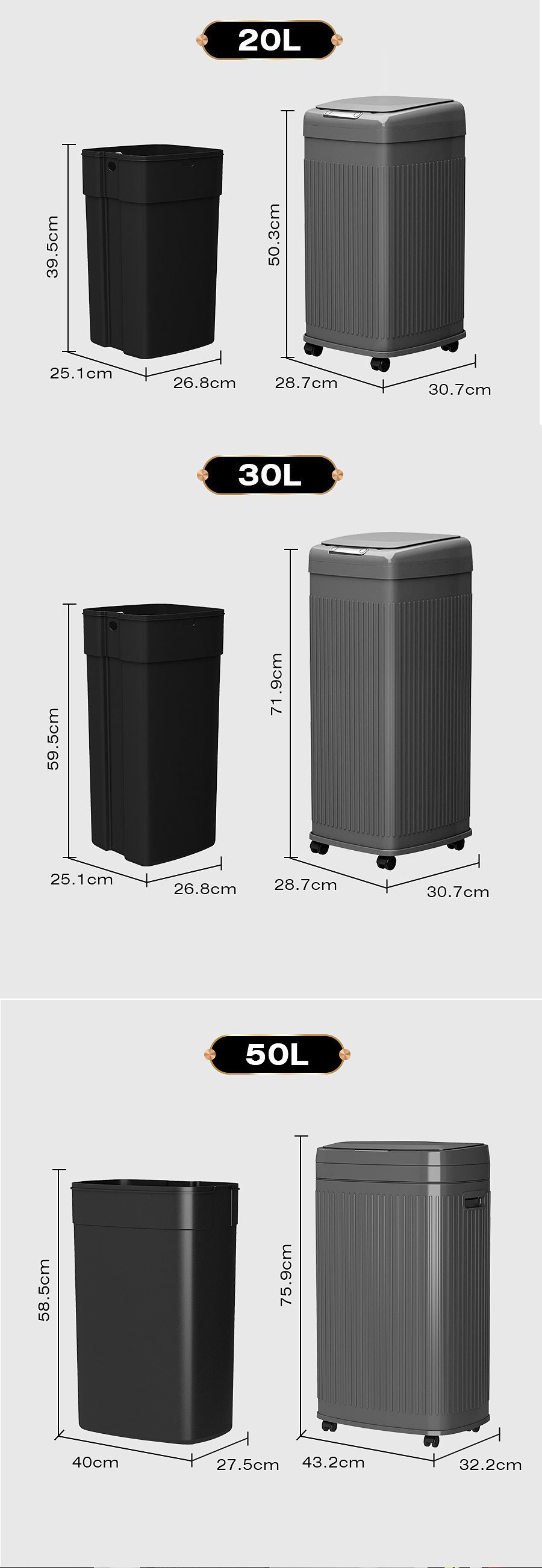 | Tamaño | 20L - con poleas [tapa abierta de tres modos de carga / inducción inteligente], 30l - con poleas [tapa abierta de tres modos de carga / inducción inteligente], 50l - con poleas [tapa abierta de tres modos de carga / inducción inteligente], 3l - modelo de escritorio [modelo de carga - modo doble de ola / inducción manual] |