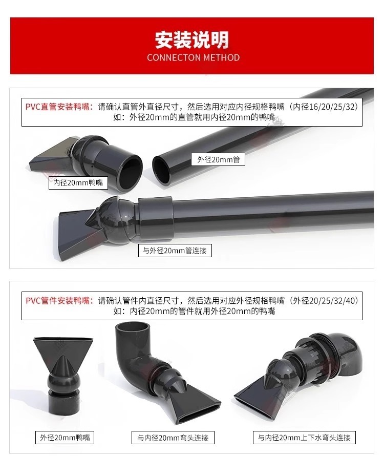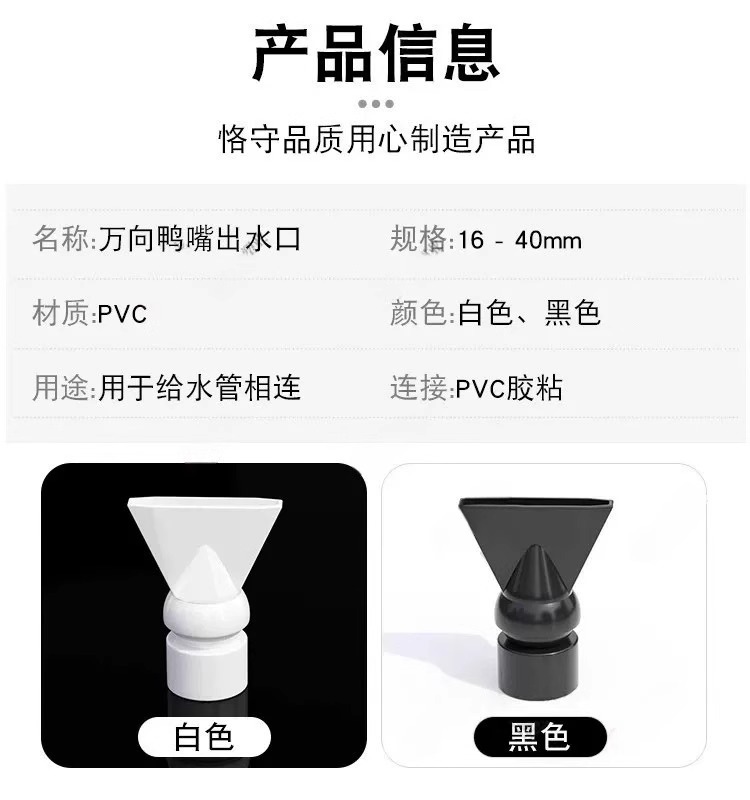| Especificaciones del producto | Pico de pato blanco 16-20 de doble uso (diámetro interior 16 diámetro exterior 20)(1200 unidades/caja),Pico de pato blanco de doble uso 20-25 (diámetro interior 20 diámetro exterior 25)(900 piezas/caja),Pico de pato blanco 25-32 de doble uso (diámetro interior 25 diámetro exterior 32)(400 unidades/caja),Pico de pato negro 16-20 de doble uso (diámetro interior 16 diámetro exterior 20)(1200 unidades/caja),Pico de pato negro 20-25 de doble uso (diámetro interior 20 diámetro exterior 25)(900 unidades/caja),Pico de pato de doble uso negro 25-32 (diámetro interior 25 diámetro exterior 32)(400 unidades/caja) |