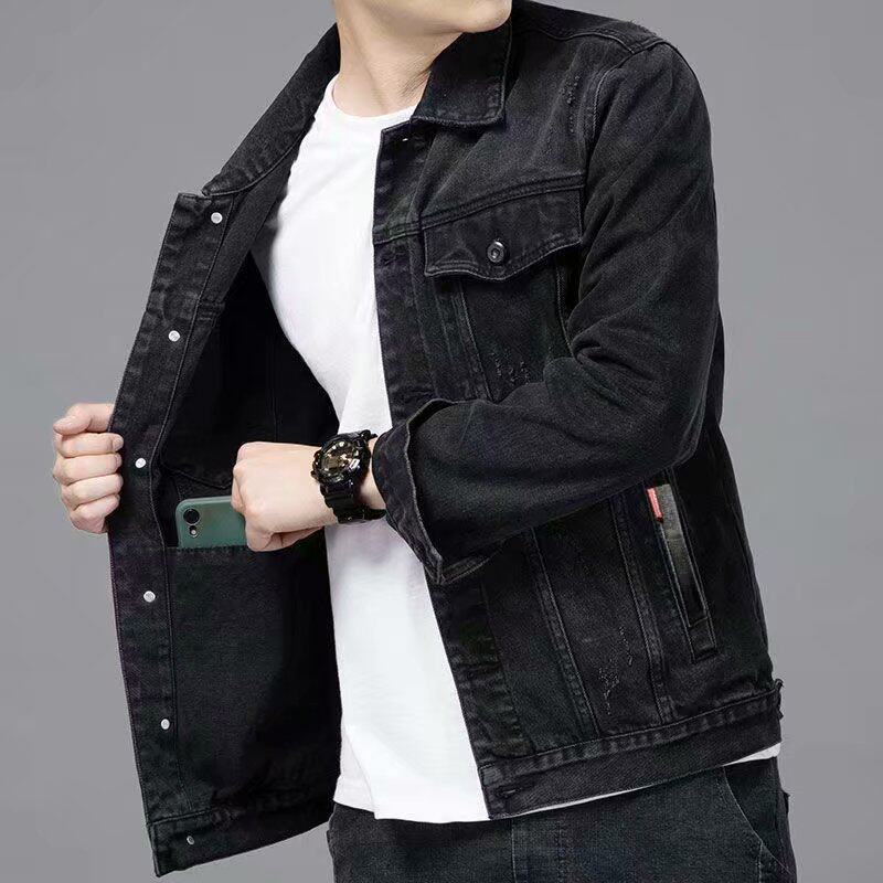 Chaqueta de mezclilla de estudiante bordada de algodón para hombre 2022 primavera nueva chaqueta casual de solapa para hombre negro