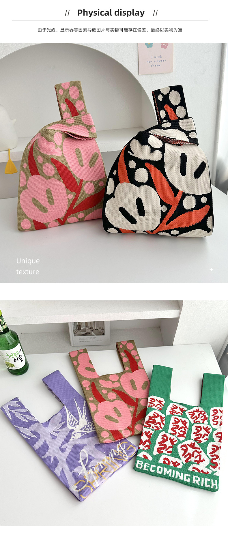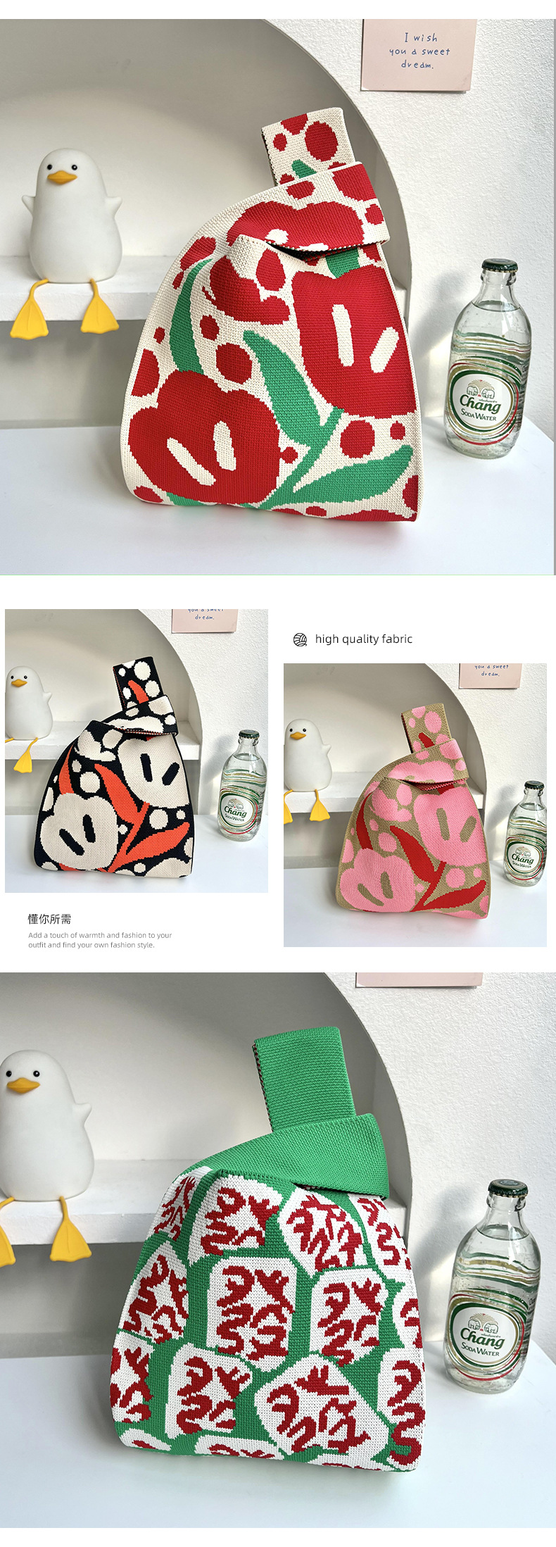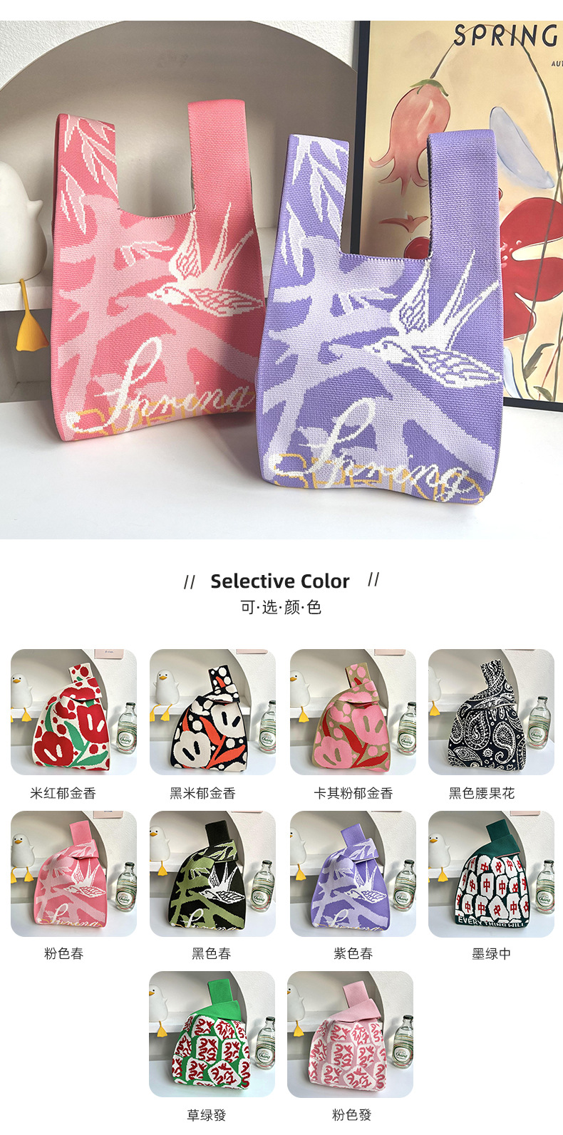 | Colores | Primavera rosa,Primavera púrpura,Primavera negra,Tulipán rojo arroz,Tulipán en polvo caqi,Cabello rosa,Paño verde hierba,Verde oscuro,Flor de anacardo negro,Cinturón de bolso blanco (ordinario),Cinturón de bolso negro (más largo) |
