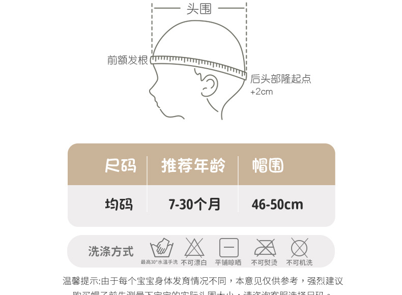 | Talla | Se recomienda 7 - 30 meses - perímetro de la cabeza 46 - 50 cm |