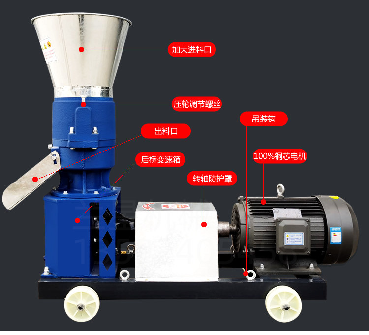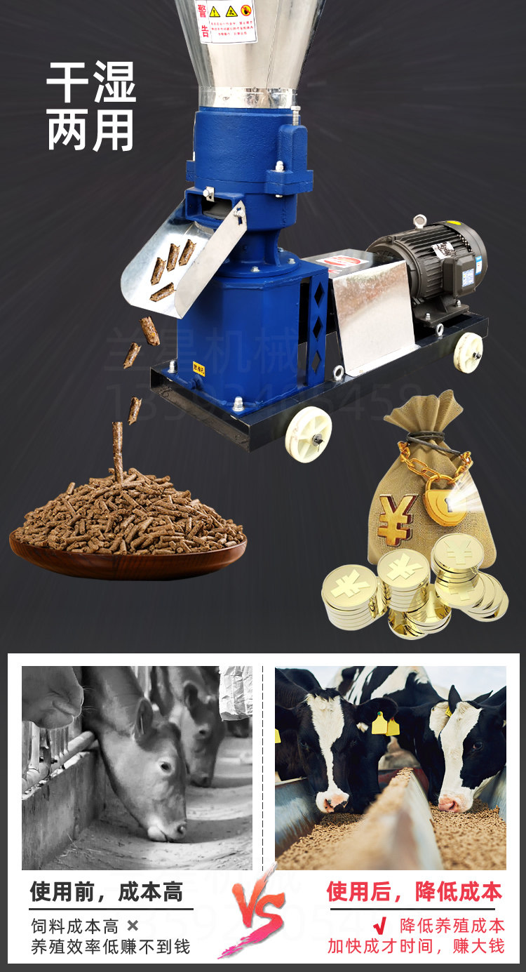 饲料颗粒机(又名:颗粒饲料机、颗粒饲料成型机),属于饲料制粒设备。是以玉米、豆粕、秸秆、草、稻壳等的粉碎物直接压制颗粒的饲料加工机械)。