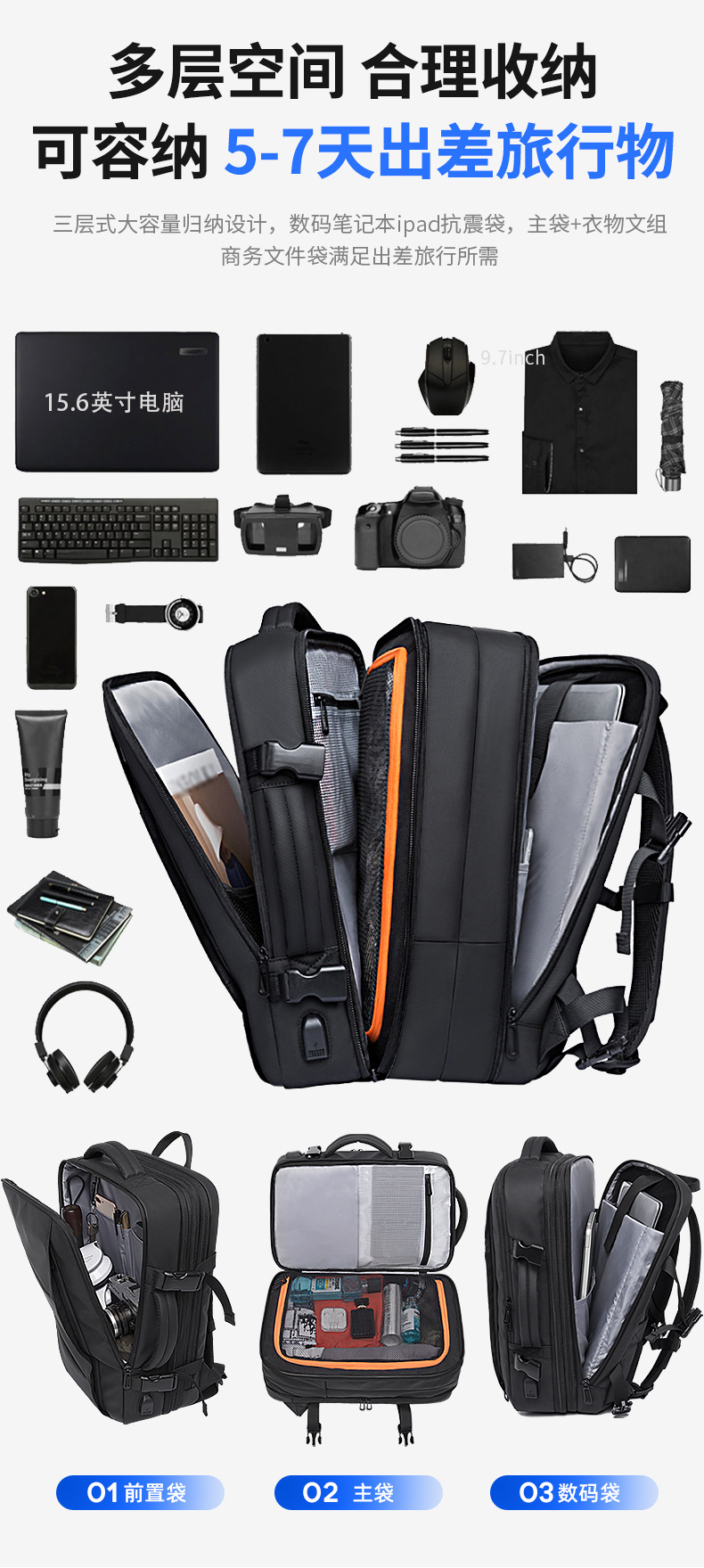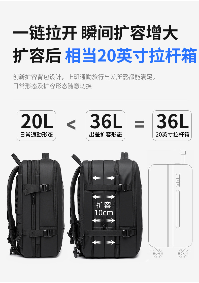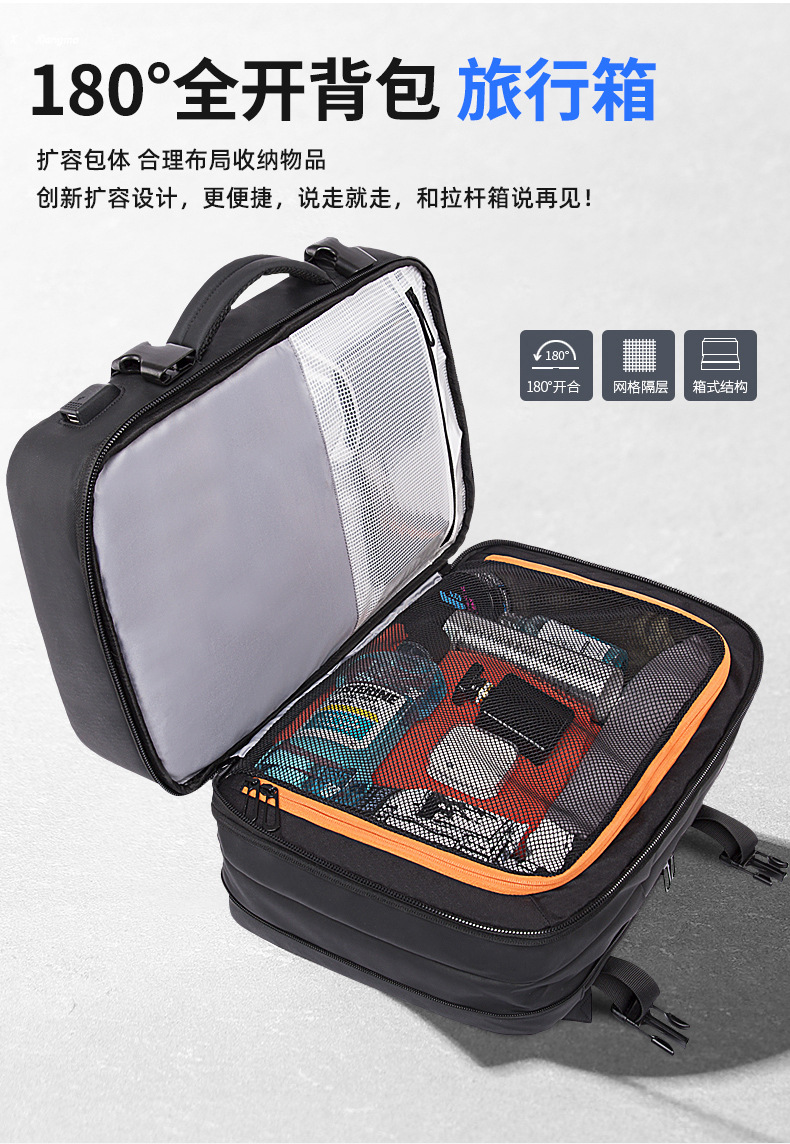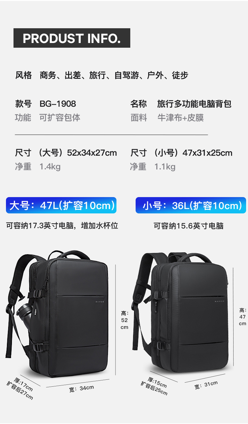Mochila BANGE de gran capacidad – mochila expandible para portátil, viaje, impermeable con puerto USB