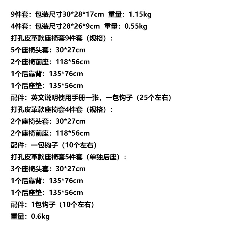 Juego de 2 piezas (asiento individual delantero),Juego de 4 piezas (dos asientos en primera fila),Juego de 9 piezas (juego completo de cinco asientos)