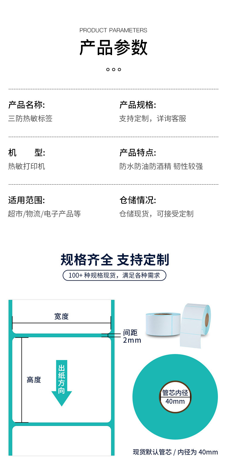 | Especificaciones y modelos | 外贸款加厚黄底43*25*1000张/卷,外贸款黄底58*40*700张/卷(100卷/箱,外贸款黄底58*60*500张/卷(100卷/箱),经济三防黄底75*120*300张/卷,外贸款黄底75*120*300张/卷(50卷/箱),黄底加厚款100*150*500张/卷,三防横版30*20*2000张/卷(100卷/箱),三防竖版30*40*800张/卷(100卷/箱),三防横板40*20*1000张/卷(100卷/箱),三防横板40*30*800张(100卷/箱),三防横板40*30*2000张(60卷/箱),三防竖版40*50*700张/卷(100卷/箱),三防竖版40*60*800张/卷(100卷/箱),三防竖版40*70*500张/卷(100卷/箱),三防横版50*25*1000张/卷,三防横板50*30*800张(100卷/箱),三防FBA跨境款50*30*1000张/卷(整箱,三防横板50*40*800张/卷(100卷/箱),三防竖版50*60*500张/卷(100卷/箱),三防竖版50*70*600张/卷(100卷/箱),三防竖版50*80*300张(100卷/箱),三防横板60*20*3000张/卷(36卷/箱),三防横板60*30*800张/卷(100卷/箱),三防蓝底60*30*2000张/卷(50卷/箱),三防横板60*40*800张/卷(100卷/箱),三防横板60*40*2400张/卷(50卷/箱),三防横板60*50*500张(100卷/箱),三防方版60*60*1000张/卷(50卷/箱),三防方版60*60*2000张/卷(整箱30卷),三防竖版60*80*500张/卷(100卷/箱),三防蓝底70*20*2000张/卷(50卷/箱),三防蓝底70*20*3000张/卷(50卷/箱),三防白底横版70*20*3000张/卷,三防蓝底70*20*5000张/卷(30卷/箱),三防横版70*30*2500张/卷(整箱24卷),三防横版70*40*1000张/卷(整箱拍80卷),三防横板70*40*2000张/卷 带撕线(40卷,三防横板70*50*500张/卷 (100卷/箱),三防横板70*50*1000张/卷(60卷/箱),三防横版70*60*500张/卷,三防横版70*60*1500张/卷(整箱36卷),三防70*70*1000张/卷(30卷/箱),三防竖版70*90*300张/卷(60卷/箱),三防竖版70*90*600张/卷(整箱50卷),三防竖版70*100*500张/卷(60卷/箱),三防横板75*50*1000张/卷,三防竖版75*100*500张/卷(整箱拍60卷),三防竖版75*105*500张/卷(40卷/箱),三防横版80*30*2000张/卷,三防横板80*40*1000张/卷(60卷/箱),三防横板80*50*500张/卷 (100卷/箱),三防横版80*50*1000张/卷,三防横版80*50*2000张/卷,三防横版80*60*500张/卷 (100卷/箱),三防横版80*60*1000张/卷(60卷/箱),三防方形80*80*500张/卷(60卷/箱),三防80*80*1000张/卷(整箱40卷),三防竖版80*100*500张/卷,三防横板100*50*1000张(50卷/箱),三防横板100*60*800张(60卷/箱),三防横板100*70*500张/卷(60卷/箱),三防横板100*75*500张/卷(30卷/箱),三防横板100*80*600张( 24卷/箱),三防方版100*100*500张/卷,三防100*150*350张/卷 (30卷/箱),三防100*150*500张/卷 (36卷/箱),三防竖版100*200*250张(40卷/箱),三防加厚品质款100*100*500张/卷,三防加厚品质款100*150*350张/卷,三防加厚品质款100*150*500张/卷,定制尺寸 |