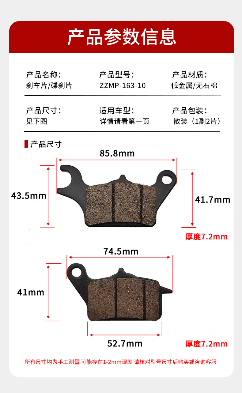 | Especificaciones del producto | Un par de pastillas de freno ZZMP-163-10 |