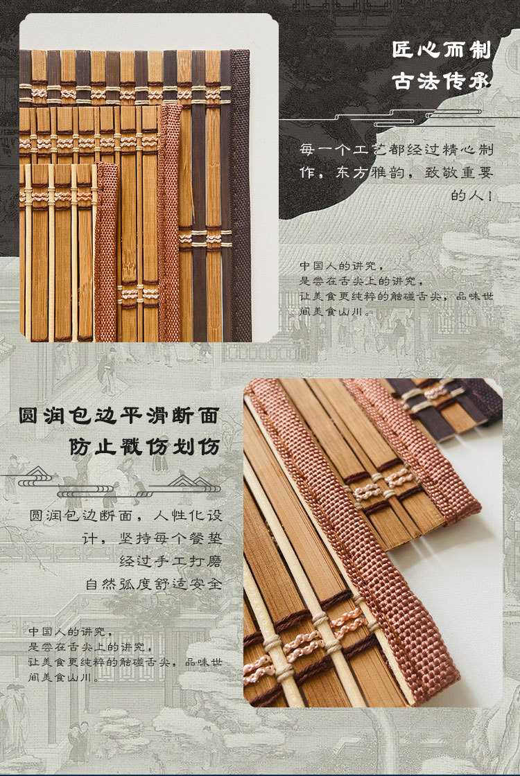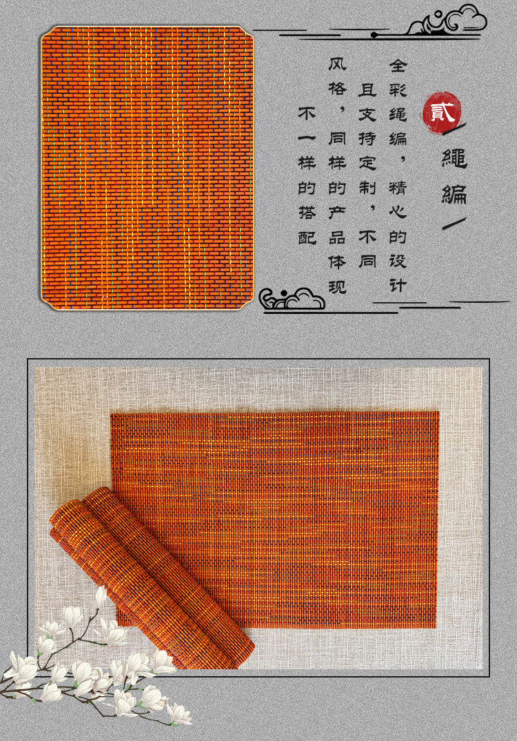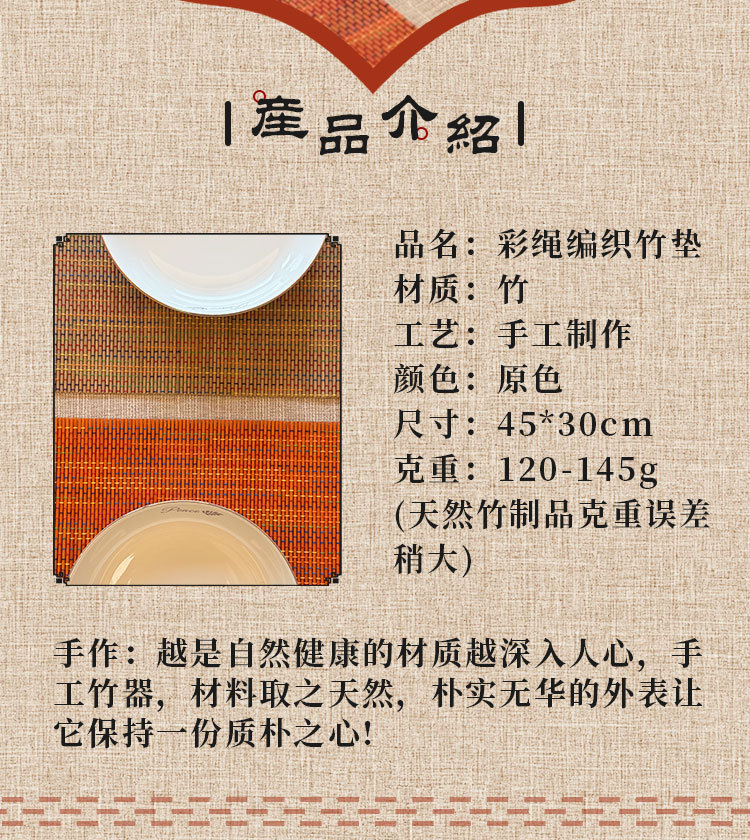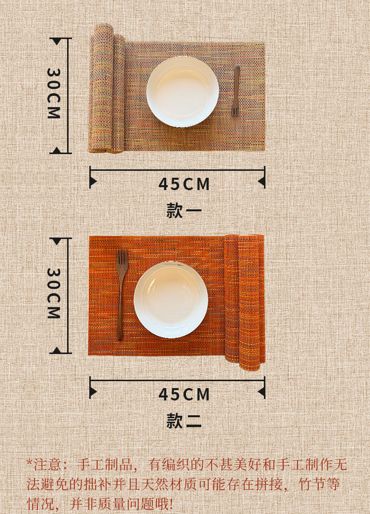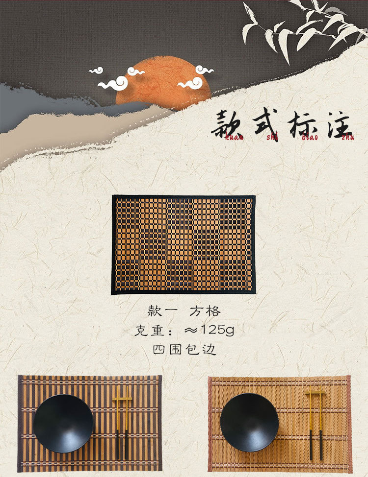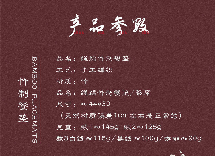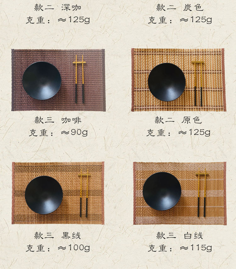 | Color | El color original del bambú tejido con cuerda de color (sin borde cubierto) ¿ 130g, el color naranja tejido con cuerda de color (sin borde cubierto) ¿ 130g, el color original del modelo 2 (borde cubierto en ambos lados) ¿ 125g, el color de carbón del modelo 2 (borde cubierto en ambos lados) ¿ 125g, el color blanco del bambú de 3 yuanes (borde cubierto en ambos lados) ¿ 115g, el color negro del bambú de 3 yuanes (borde cubierto en ambos lados) ¿ 100g, el café de bambú de 3 yuanes (borde cubierto en ambos lados) ¿ 90g, el color cuadrado 1 (borde cubierto en todos los lados) ¿ 145g |