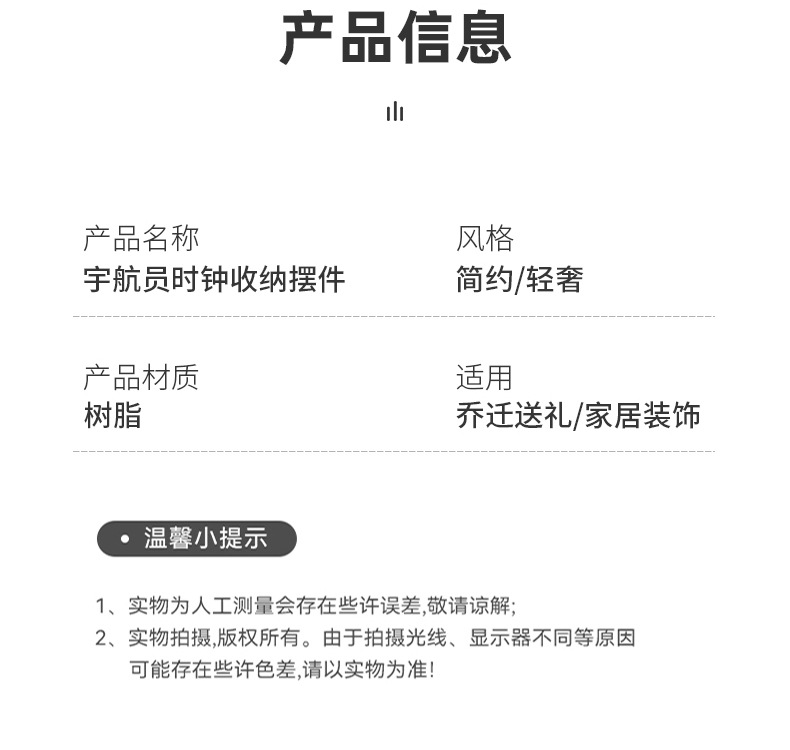 | Color | El reloj del astronauta alberga adornos - gris, el reloj del astronauta alberga adornos - amarillo, el astronauta alberga adornos - gris, el astronauta alberga adornos - amarillo, el astronauta instala la Luna - blanco, el astronauta instala la Luna - azul, el astronauta instala la Luna - naranja |