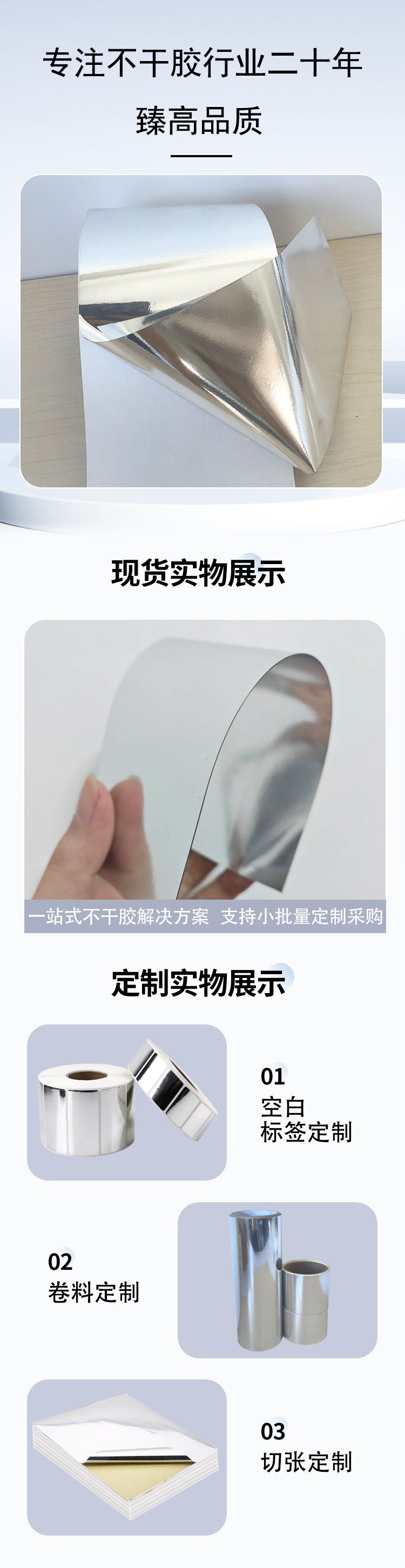 | Características del producto | Brillo metálico plateado, impermeable, resistente al aceite, no se puede rasgar, resistente a altas y bajas temperaturas, resistente a la corrosión, fuerte resistencia a la tracción, resistencia al desgaste, impresión clara |