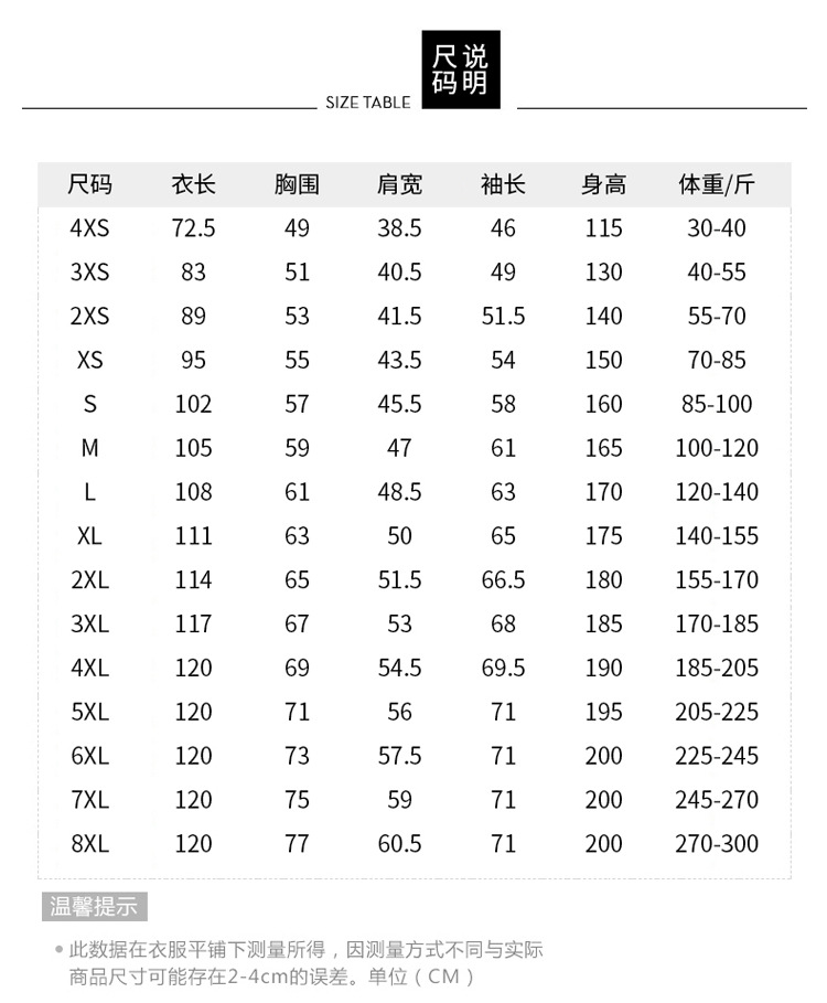 | Talla | 4XS,3XS,2XS,XS,S,M,L,XL,2XL,3XL,4XL,5XL,6XL,7XL,8XL |