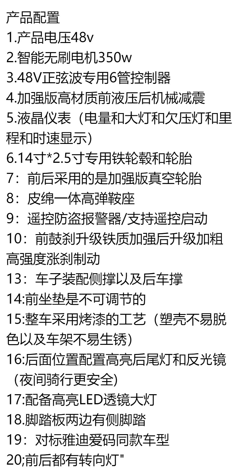 | Especificación | Batería de plomo-ácido Chaowei/Tianneng de 12A,Batería de litio 12A/batería especial,Batería especial de plomo-ácido de grafeno 14A,Batería de litio 15A/batería especial,Batería de litio 20A/batería especial,Batería de plomo-ácido/Chaowei de 12 A,Batería de plomo-ácido/Chaowei de 20 A,Pedido de pedido de carrocería de exportación,Batería de litio 12A/duración de la batería Chaowei 50Km,La batería de litio de 20 A/batería Chaowei dura 70 km |