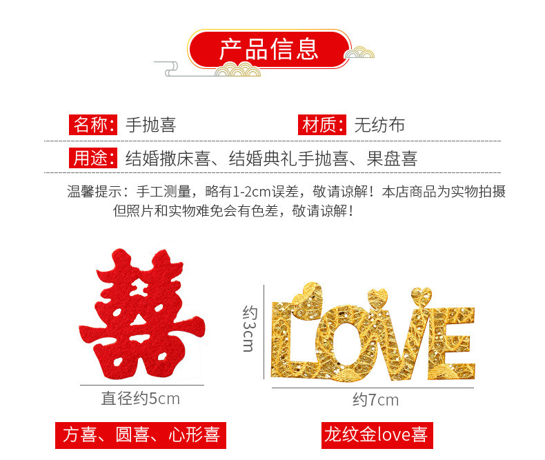 | Especificaciones | Fang Xi 30 piezas,Pétalo Xi 30 piezas,30 piezas de felicidad de reunión,Xi en forma de corazón 30 piezas,Ronda Xi 30 piezas,Caoxi 30 tabletas,30 piezas de flor de ciruelo |