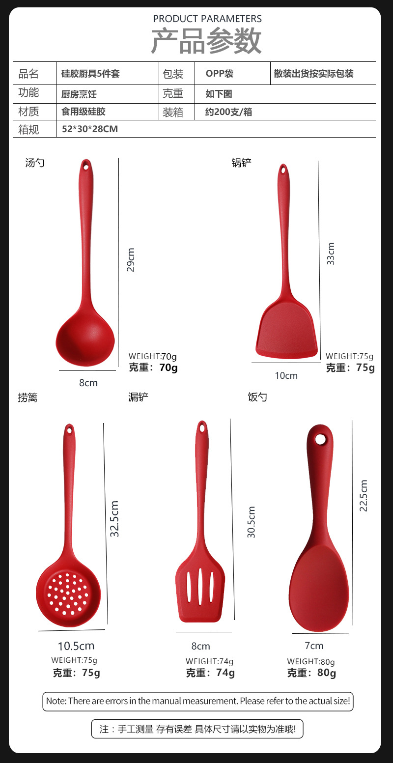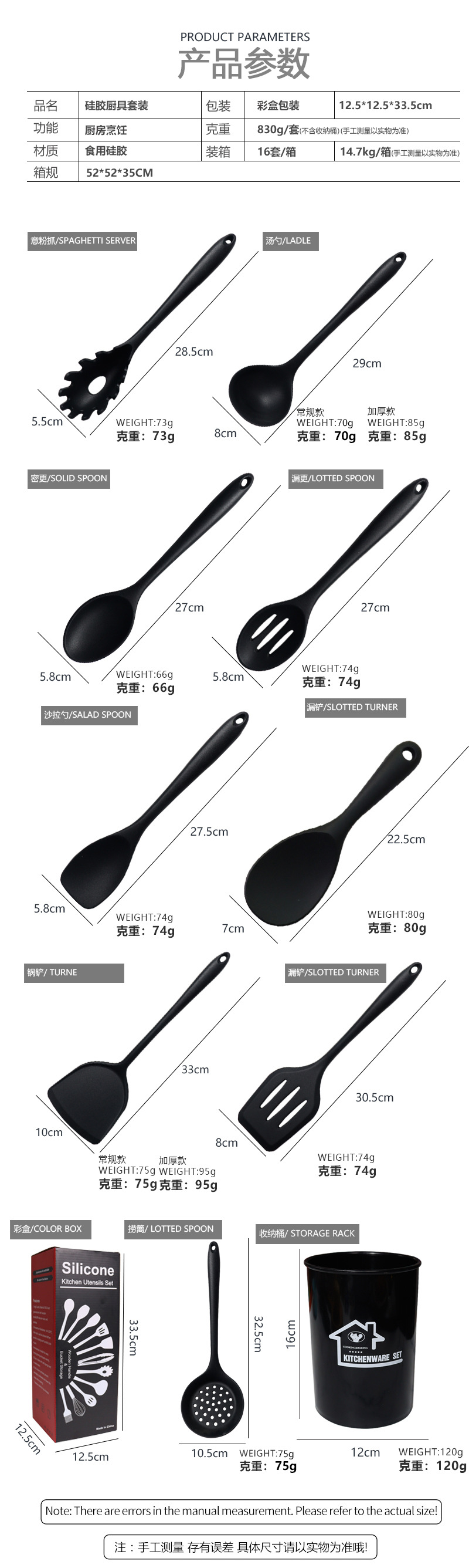 | Tamaño | Espátula de silicona 58g,Pala china regular,Pala china engrosada,Cuchara de sopa,Cuchara espesa,Barrera,Pala con fugas,Garra de polvo,Cuchara de arroz,Un colador,Cuchara,Cuchara de ensalada,Barril de almacenamiento,Juego de hornear 5 piezas,Juego de repostería de 6 piezas.,Juego de 5 piezas de utensilios de cocina de silicona,Juego de utensilios de cocina de silicona de 8 piezas [embalaje de caja de color],Cubo de almacenamiento de 8 piezas de utensilios de cocina de silicona [embalaje de caja de color],Juego de utensilios de cocina de silicona de 10 piezas [embalaje de caja de color],Juego de utensilios de cocina de silicona de 15 piezas [embalaje en caja de color] |