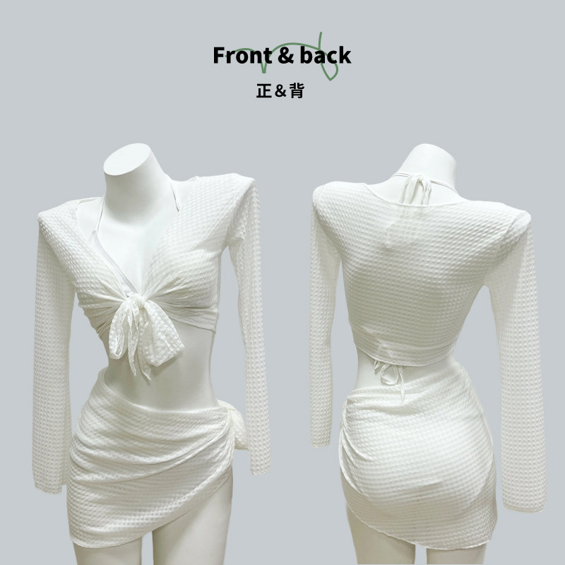 | Diseño de estilo | Manga larga, cuello en V, diseño de correas, ombligo corto, falda irregular (parte inferior) |