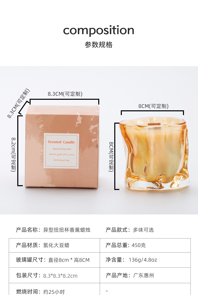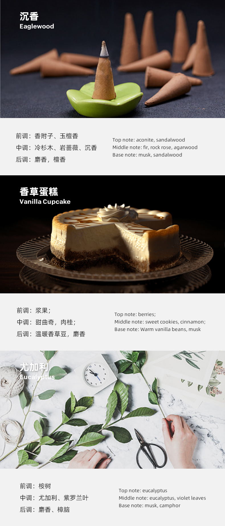 | Tamaño | Copa de ámbar: madera de agar (Eaglewood),Copa de ámbar: Pastel de vainilla (Vanilla Cupcake),Taza gris: Eucalyptus,Taza gris: Sándalo (Santal 33) |