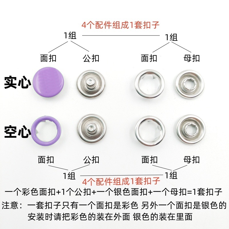 规 格:实心面扣 面直径10mm,空心面扣 面直径9.5mm,公扣直径9.5mm,母扣直径9.5mm