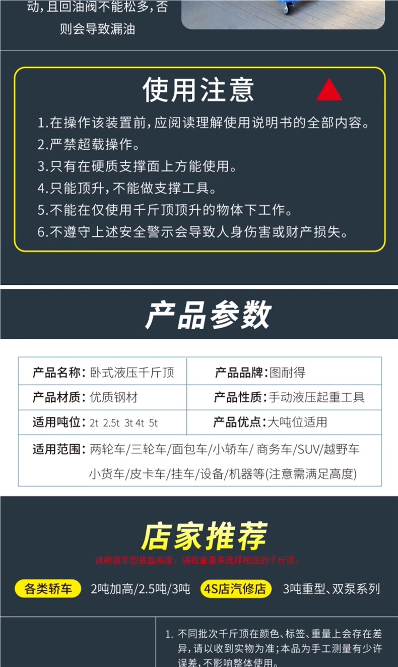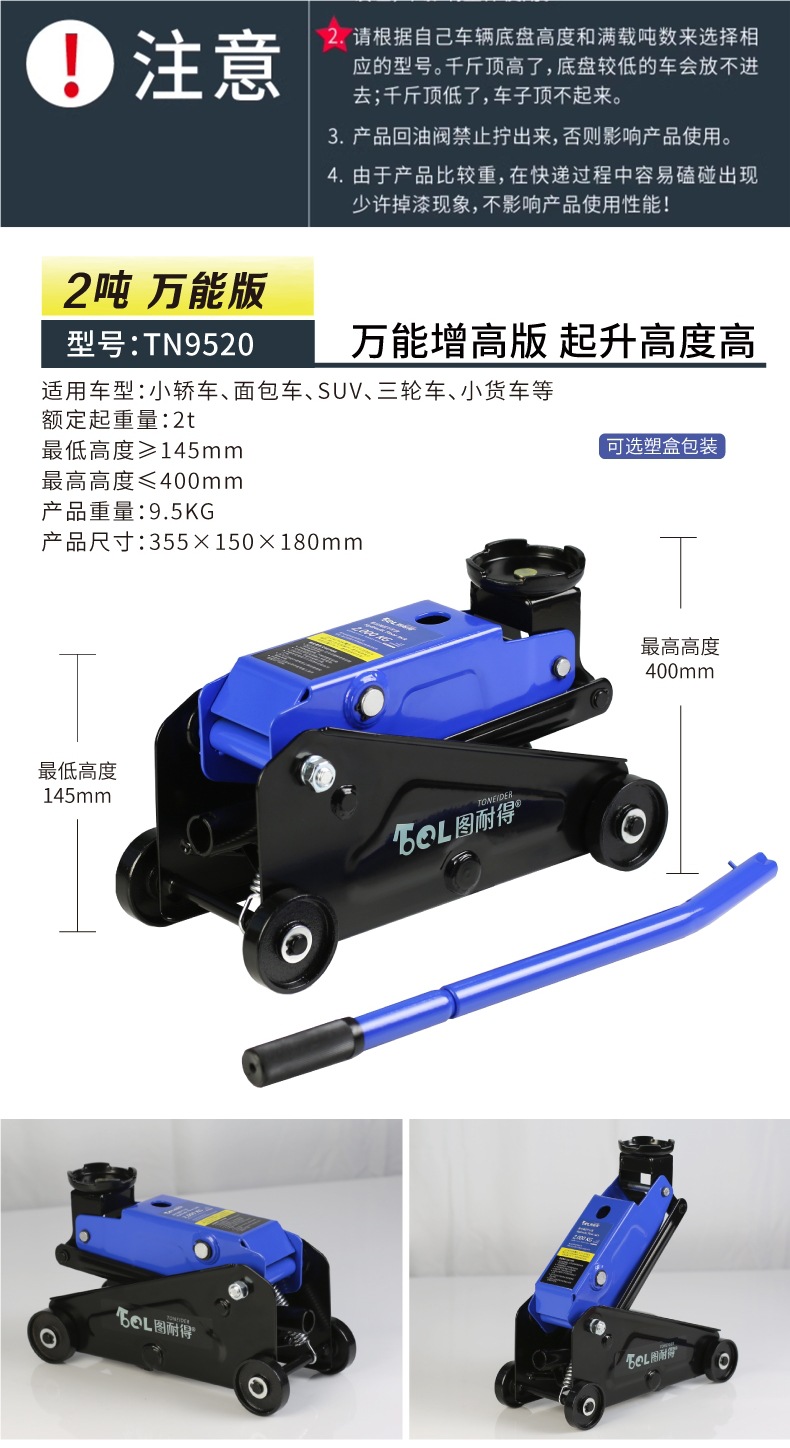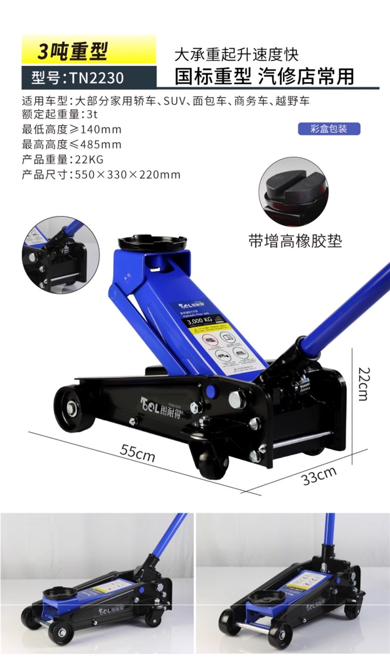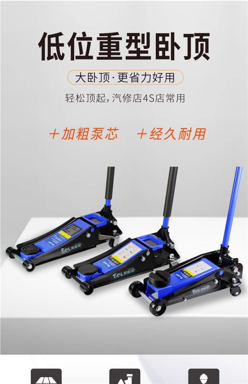| Modelo | Versión universal de 2 toneladas - caja de cartón, versión universal de 2 toneladas - caja de plástico, 2,5 toneladas de refuerzo Todopoderoso súper bajo - caja de cartón, 2,5 toneladas de refuerzo Todopoderoso súper bajo - paquete de almacenamiento, 2,5 toneladas de refuerzo Todopoderoso súper bajo - caja de plástico, 2,5 toneladas de refuerzo - caja de plástico + paquete de mantenimiento, 2,5 toneladas de refuerzo integrado [con llave inglesa / barra de presión 360 grados de rotación libre], 2,5 toneladas de refuerzo [barra de presión 360 grados de rotación libre] - caja de cartón, 2,5 toneladas de refuerzo [barra de presión 360 grados de rotación libre] - paquete de almacenamiento, 2,5 toneladas de refuerzo [barra de presión 360 grados de rotación libre] - paquete de almacenamiento, Reparación 3 toneladas de refuerzo de elevación [caja de cartón], 3 toneladas de refuerzo de elevación [paquete de almacenamiento], 3 toneladas de refuerzo de elevación [caja de plástico], 3 toneladas de SUV grandes [caja de cartón] especial, 3 toneladas de SUV grandes [paquete de almacenamiento] especial, 3 toneladas de almohadilla de Goma pesada + almohadilla de Goma de aumento [comúnmente utilizada en la tienda de reparación de automóviles], 3 toneladas de almohadilla de Goma pesada + almohadilla de Goma de aumento + llave de 18 pulgadas, 3 toneladas de almohadilla de Goma pesada + almohadilla de Goma de aumento + soporte de Seguridad de 3 toneladas + llave de 18 pulgadas, 3,5 toneladas de almohadilla de Goma pesada + almohadilla de Goma de aumento [comúnmente utilizada en la tienda de reparación de automóviles], 3,5 toneladas de almohadilla de Goma pesada + almohadilla de Goma de aumento + soporte de Seguridad de 3 toneladas, 3,5 toneladas de almohadilla de Goma pesada + soporte de Goma de aumento + llave de 18 pulgadas, 3 toneladas de almohadilla de Goma súper baja [comúnmente utilizada en la tienda de reparación de automóviles]], 3 toneladas de doble bomba súper baja + almohadilla de Goma + llave inglesa de 18 pulgadas, 3 toneladas de doble bomba súper baja + almohadilla de Goma + soporte de Seguridad de 3 toneladas, 3 toneladas de doble bomba súper baja + almohadilla de Goma + soporte de Seguridad de 3 toneladas + llave inglesa de 18 pulgadas, 3 toneladas de doble bomba súper baja más alta [comúnmente utilizada en talleres de reparación de automóviles], 3 toneladas de doble bomba súper baja más alta + llave inglesa de 18 pulgadas, 3 toneladas de doble bomba súper bajo + 3 toneladas de soporte de seguridad, 3 toneladas de soporte de Seguridad súper bajo + 3 toneladas de soporte de Seguridad + 18 pulgadas de llave inglesa, 4 toneladas de soporte de bomba doble súper bajo + 18 pulgadas de llave inglesa, 4 toneladas de soporte de Seguridad súper bajo + 3 toneladas de soporte de seguridad, 4 toneladas de soporte de bomba doble súper bajo + 3 toneladas de soporte de Seguridad + 18 pulgadas de llave inglesa, 5 toneladas de soporte de Seguridad súper bajo + 18 pulgadas de llave inglesa, 5 toneladas de doble bomba súper bajo + 18 pulgadas de llave inglesa, 5 toneladas de soporte de Seguridad súper bajo + 6 toneladas de soporte de bomba doble + 18 pulgadas de llave inglesa |