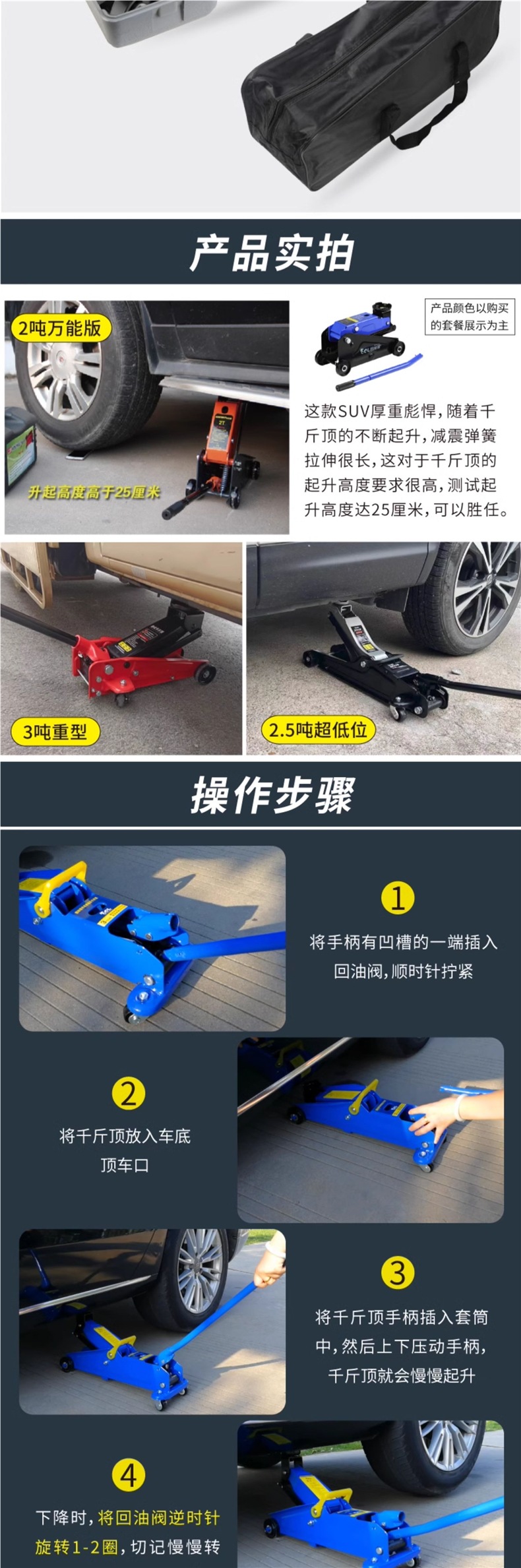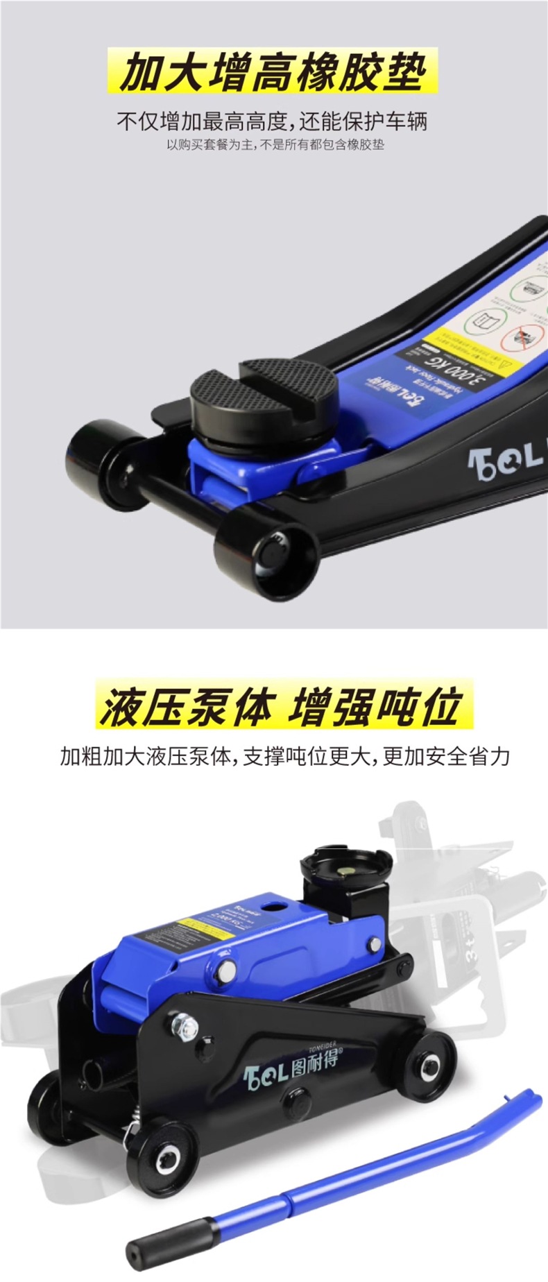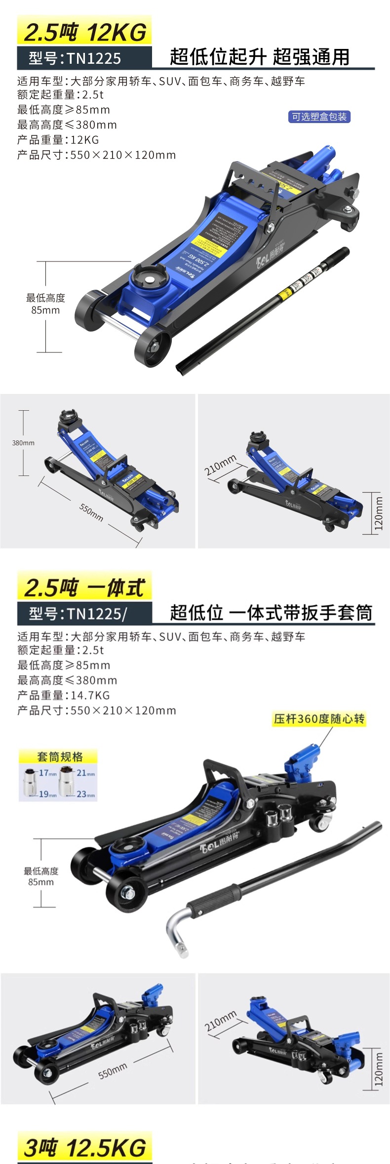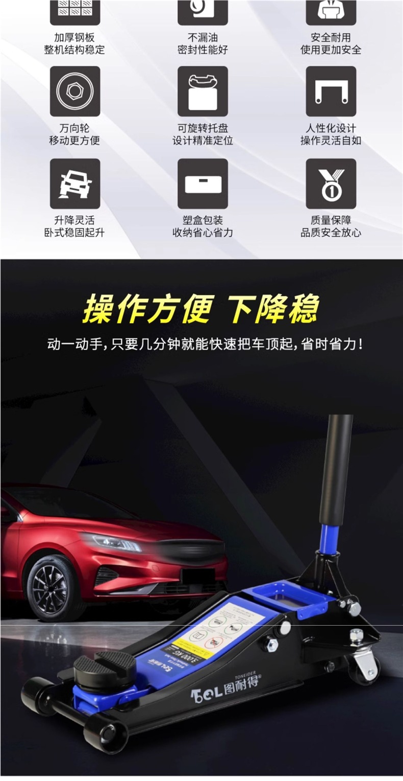 | Modelo | Versión universal de 2 toneladas - caja de cartón, versión universal de 2 toneladas - caja de plástico, 2,5 toneladas de refuerzo Todopoderoso súper bajo - caja de cartón, 2,5 toneladas de refuerzo Todopoderoso súper bajo - paquete de almacenamiento, 2,5 toneladas de refuerzo Todopoderoso súper bajo - caja de plástico, 2,5 toneladas de refuerzo - caja de plástico + paquete de mantenimiento, 2,5 toneladas de refuerzo integrado [con llave inglesa / barra de presión 360 grados de rotación libre], 2,5 toneladas de refuerzo [barra de presión 360 grados de rotación libre] - caja de cartón, 2,5 toneladas de refuerzo [barra de presión 360 grados de rotación libre] - paquete de almacenamiento, 2,5 toneladas de refuerzo [barra de presión 360 grados de rotación libre] - paquete de almacenamiento, Reparación 3 toneladas de refuerzo de elevación [caja de cartón], 3 toneladas de refuerzo de elevación [paquete de almacenamiento], 3 toneladas de refuerzo de elevación [caja de plástico], 3 toneladas de SUV grandes [caja de cartón] especial, 3 toneladas de SUV grandes [paquete de almacenamiento] especial, 3 toneladas de almohadilla de Goma pesada + almohadilla de Goma de aumento [comúnmente utilizada en la tienda de reparación de automóviles], 3 toneladas de almohadilla de Goma pesada + almohadilla de Goma de aumento + llave de 18 pulgadas, 3 toneladas de almohadilla de Goma pesada + almohadilla de Goma de aumento + soporte de Seguridad de 3 toneladas + llave de 18 pulgadas, 3,5 toneladas de almohadilla de Goma pesada + almohadilla de Goma de aumento [comúnmente utilizada en la tienda de reparación de automóviles], 3,5 toneladas de almohadilla de Goma pesada + almohadilla de Goma de aumento + soporte de Seguridad de 3 toneladas, 3,5 toneladas de almohadilla de Goma pesada + soporte de Goma de aumento + llave de 18 pulgadas, 3 toneladas de almohadilla de Goma súper baja [comúnmente utilizada en la tienda de reparación de automóviles]], 3 toneladas de doble bomba súper baja + almohadilla de Goma + llave inglesa de 18 pulgadas, 3 toneladas de doble bomba súper baja + almohadilla de Goma + soporte de Seguridad de 3 toneladas, 3 toneladas de doble bomba súper baja + almohadilla de Goma + soporte de Seguridad de 3 toneladas + llave inglesa de 18 pulgadas, 3 toneladas de doble bomba súper baja más alta [comúnmente utilizada en talleres de reparación de automóviles], 3 toneladas de doble bomba súper baja más alta + llave inglesa de 18 pulgadas, 3 toneladas de doble bomba súper bajo + 3 toneladas de soporte de seguridad, 3 toneladas de soporte de Seguridad súper bajo + 3 toneladas de soporte de Seguridad + 18 pulgadas de llave inglesa, 4 toneladas de soporte de bomba doble súper bajo + 18 pulgadas de llave inglesa, 4 toneladas de soporte de Seguridad súper bajo + 3 toneladas de soporte de seguridad, 4 toneladas de soporte de bomba doble súper bajo + 3 toneladas de soporte de Seguridad + 18 pulgadas de llave inglesa, 5 toneladas de soporte de Seguridad súper bajo + 18 pulgadas de llave inglesa, 5 toneladas de doble bomba súper bajo + 18 pulgadas de llave inglesa, 5 toneladas de soporte de Seguridad súper bajo + 6 toneladas de soporte de bomba doble + 18 pulgadas de llave inglesa |