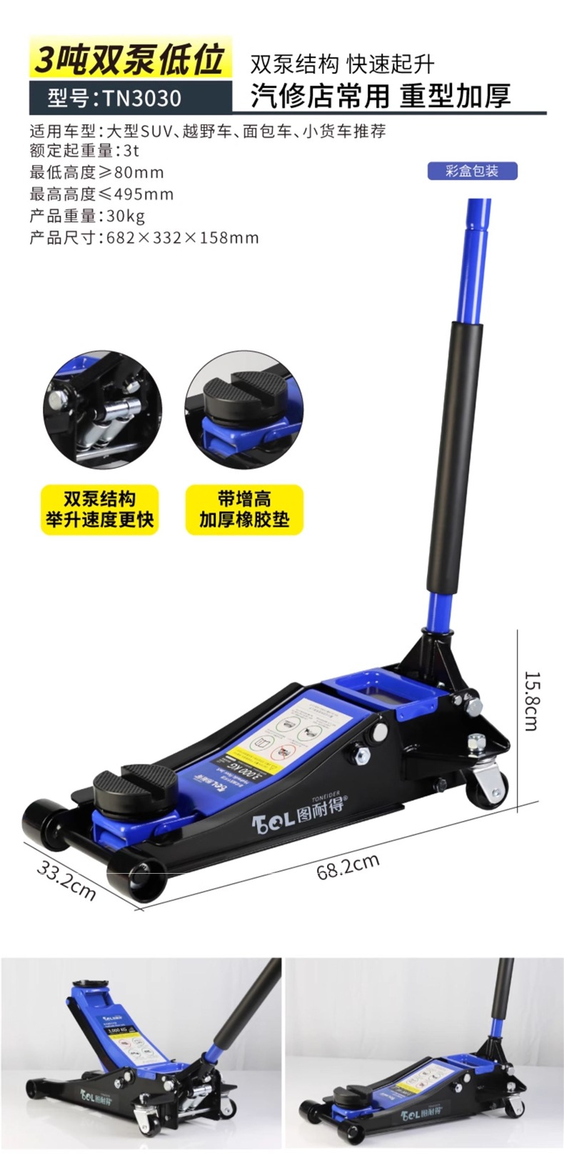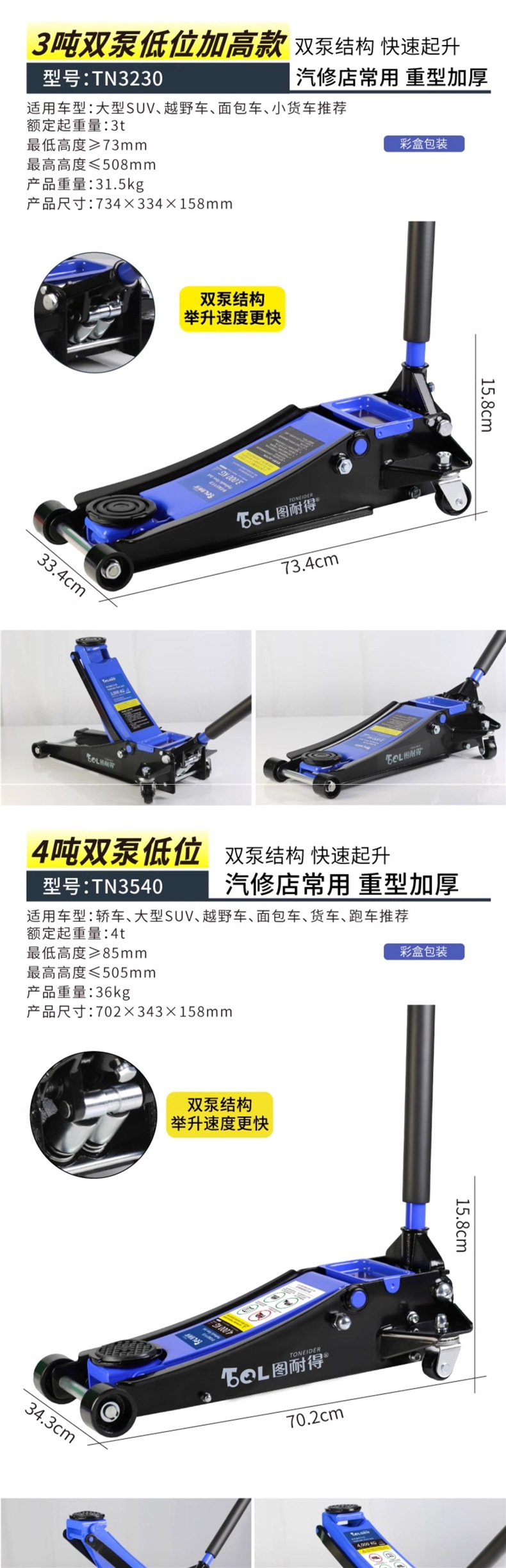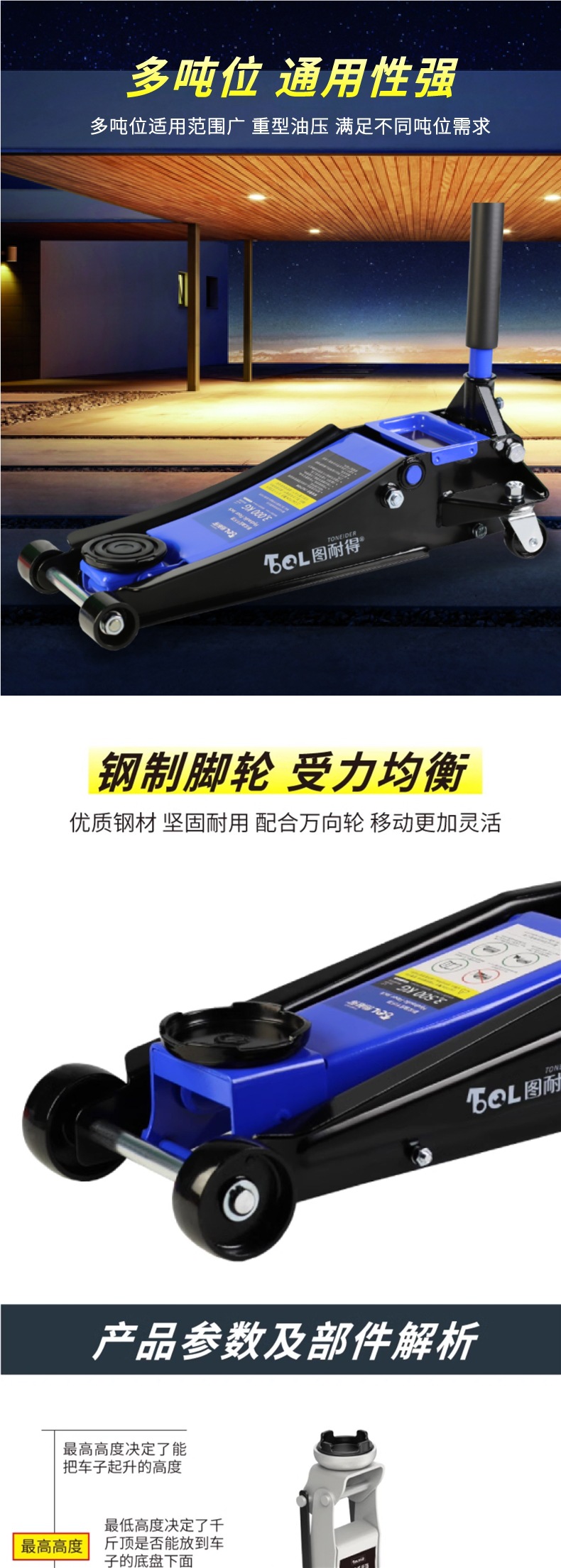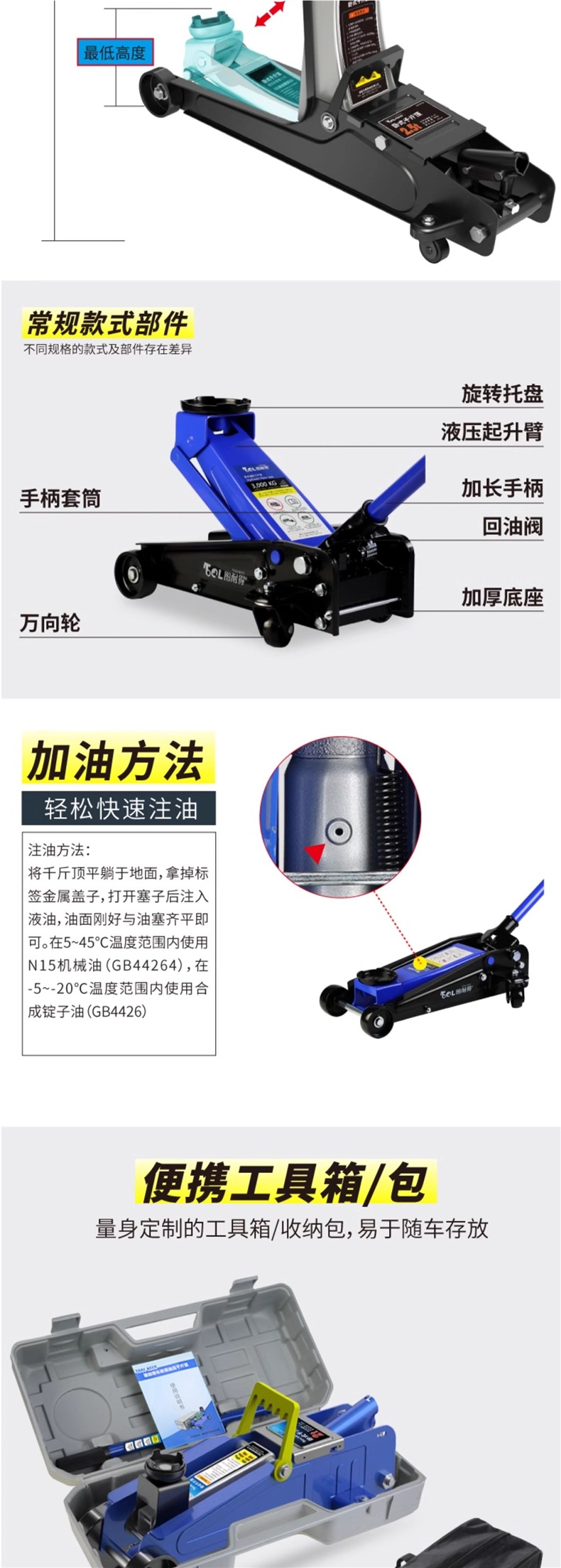 | Modelo | Versión universal de 2 toneladas - caja de cartón, versión universal de 2 toneladas - caja de plástico, 2,5 toneladas de refuerzo Todopoderoso súper bajo - caja de cartón, 2,5 toneladas de refuerzo Todopoderoso súper bajo - paquete de almacenamiento, 2,5 toneladas de refuerzo Todopoderoso súper bajo - caja de plástico, 2,5 toneladas de refuerzo - caja de plástico + paquete de mantenimiento, 2,5 toneladas de refuerzo integrado [con llave inglesa / barra de presión 360 grados de rotación libre], 2,5 toneladas de refuerzo [barra de presión 360 grados de rotación libre] - caja de cartón, 2,5 toneladas de refuerzo [barra de presión 360 grados de rotación libre] - paquete de almacenamiento, 2,5 toneladas de refuerzo [barra de presión 360 grados de rotación libre] - paquete de almacenamiento, Reparación 3 toneladas de refuerzo de elevación [caja de cartón], 3 toneladas de refuerzo de elevación [paquete de almacenamiento], 3 toneladas de refuerzo de elevación [caja de plástico], 3 toneladas de SUV grandes [caja de cartón] especial, 3 toneladas de SUV grandes [paquete de almacenamiento] especial, 3 toneladas de almohadilla de Goma pesada + almohadilla de Goma de aumento [comúnmente utilizada en la tienda de reparación de automóviles], 3 toneladas de almohadilla de Goma pesada + almohadilla de Goma de aumento + llave de 18 pulgadas, 3 toneladas de almohadilla de Goma pesada + almohadilla de Goma de aumento + soporte de Seguridad de 3 toneladas + llave de 18 pulgadas, 3,5 toneladas de almohadilla de Goma pesada + almohadilla de Goma de aumento [comúnmente utilizada en la tienda de reparación de automóviles], 3,5 toneladas de almohadilla de Goma pesada + almohadilla de Goma de aumento + soporte de Seguridad de 3 toneladas, 3,5 toneladas de almohadilla de Goma pesada + soporte de Goma de aumento + llave de 18 pulgadas, 3 toneladas de almohadilla de Goma súper baja [comúnmente utilizada en la tienda de reparación de automóviles]], 3 toneladas de doble bomba súper baja + almohadilla de Goma + llave inglesa de 18 pulgadas, 3 toneladas de doble bomba súper baja + almohadilla de Goma + soporte de Seguridad de 3 toneladas, 3 toneladas de doble bomba súper baja + almohadilla de Goma + soporte de Seguridad de 3 toneladas + llave inglesa de 18 pulgadas, 3 toneladas de doble bomba súper baja más alta [comúnmente utilizada en talleres de reparación de automóviles], 3 toneladas de doble bomba súper baja más alta + llave inglesa de 18 pulgadas, 3 toneladas de doble bomba súper bajo + 3 toneladas de soporte de seguridad, 3 toneladas de soporte de Seguridad súper bajo + 3 toneladas de soporte de Seguridad + 18 pulgadas de llave inglesa, 4 toneladas de soporte de bomba doble súper bajo + 18 pulgadas de llave inglesa, 4 toneladas de soporte de Seguridad súper bajo + 3 toneladas de soporte de seguridad, 4 toneladas de soporte de bomba doble súper bajo + 3 toneladas de soporte de Seguridad + 18 pulgadas de llave inglesa, 5 toneladas de soporte de Seguridad súper bajo + 18 pulgadas de llave inglesa, 5 toneladas de doble bomba súper bajo + 18 pulgadas de llave inglesa, 5 toneladas de soporte de Seguridad súper bajo + 6 toneladas de soporte de bomba doble + 18 pulgadas de llave inglesa |