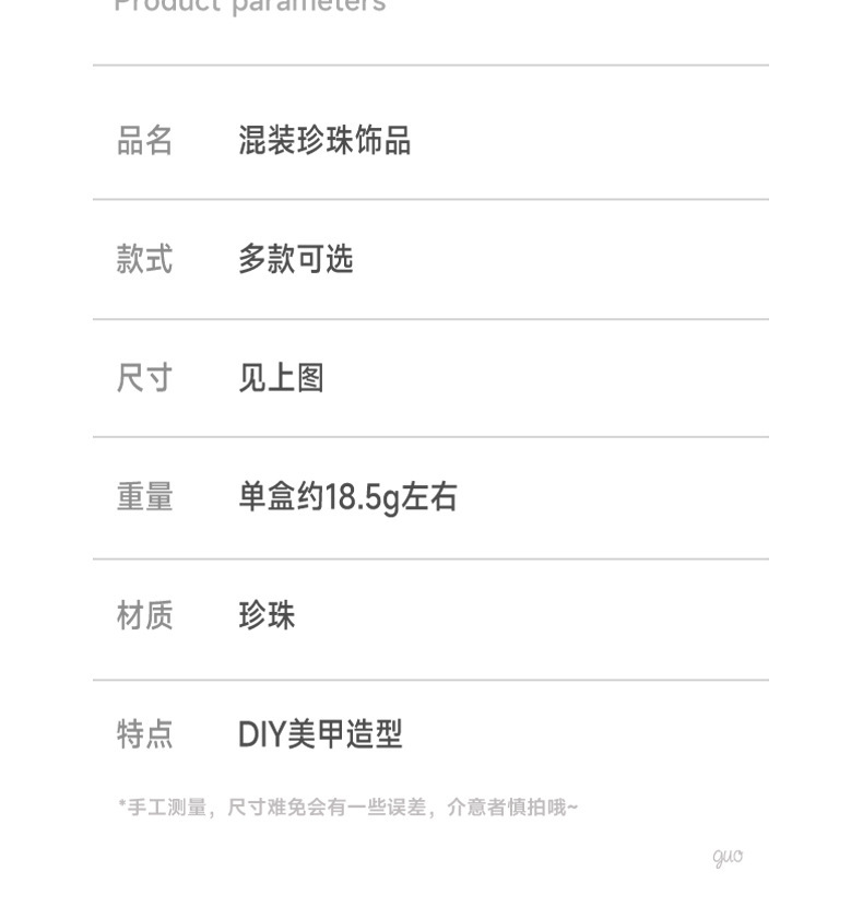 | Especificaciones | 6 g de blanco redondo (yh338 - 21), 6 g de blanco puro medio círculo (yh338 - 22), 6 g de blanco puro medio círculo (yh338 - 23), 6 g de blanco puro medio círculo (yh338 - 24), 12 g de blanco puro + medio Círculo Blanco de arroz (yh338 - 25), 12 g de blanco puro + medio Círculo Blanco de arroz (yh338 - 26), 6 g de blanco puro medio círculo (yh338 - 10), 6 g de blanco medio círculo (yh338 - 07), 6 g de blanco puro + medio Círculo Blanco de arroz (yh338 - 11), 6 g de perlas de tamaño blanco mixto (yh338 - 09)(2) |