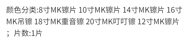 | Colores | Platillo de 16 pulgadas (sin logotipo),Platillo de 18 pulgadas (sin logotipo),Platillo de 20 pulgadas (sin logo),Platillo de 14 pulgadas (sin logotipo),Platillo MK de 10 pulgadas,12 pulgadas MK platillo,Platillo MK de 14 pulgadas,Platillo colgante MK de 16 pulgadas,Platillo de acento MK de 18 pulgadas,Platillo dingding MK de 20 pulgadas,Juego de cuatro platillos MK (14-14-16-20),Juego de cinco piezas de platillos MK (14-14-16-18-20),Juego de cuatro platillos ipusen de comercio exterior (14-14-16-20),Juego de platillos de comercio exterior de cinco piezas (14-14-16-18-20) |
