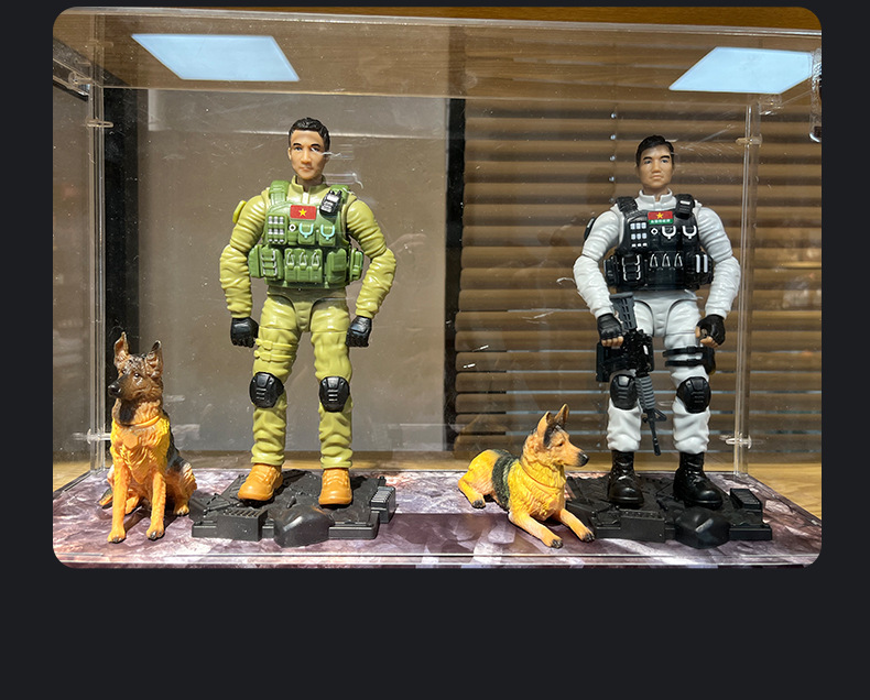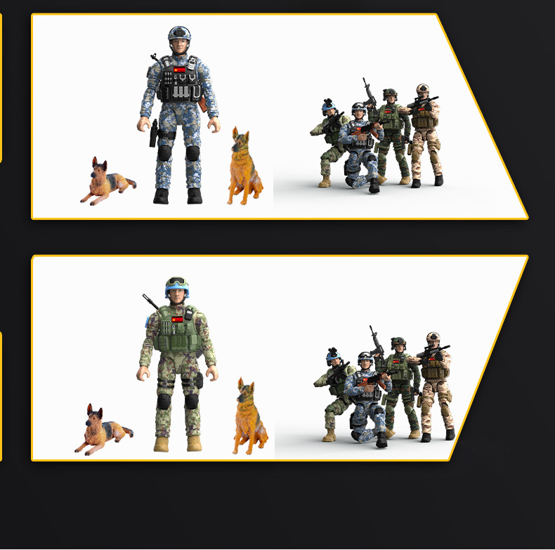 | Color | Caja de visualización de PVC - 6 soldados especiales al azar 1, caja de visualización de ventanas abiertas - 6 soldados especiales al azar 1, caja de visualización de ventanas dobles - 6 soldados especiales al azar 1, caja de visualización de libros - mantenimiento de la paz, caja de visualización de libros - marines del dragón oculto, caja de visualización de libros - comando de lobo solitario, caja de visualización de libros - equipo de élite de cuchilla, perro de policía - 2 posturas al azar 1 |
