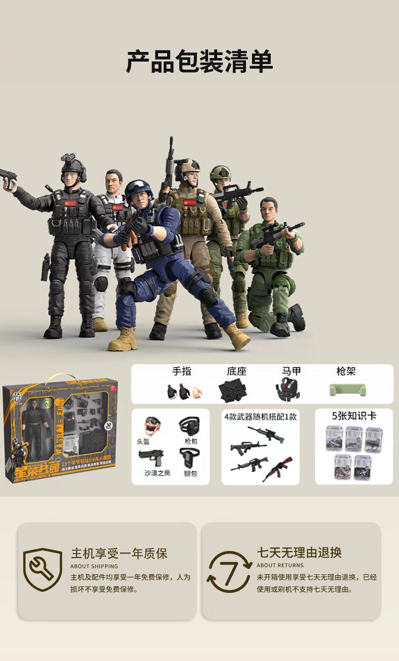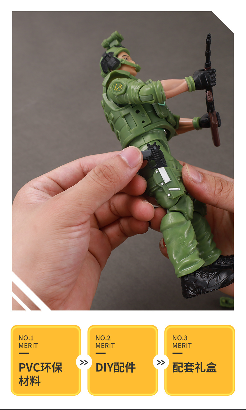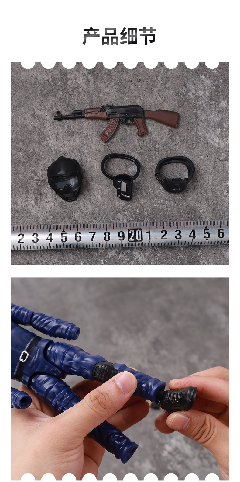 | Modelo de Soldados | El cuerpo del producto está hecho de nuevo material ABS, la cabeza y los accesorios de las extremidades están hechos de material sólido de PVC respetuoso con el medio ambiente, y la modelado de la figura adopta un recubrimiento de transferencia de agua respetuoso con el medio ambiente para no perder la pintura. |