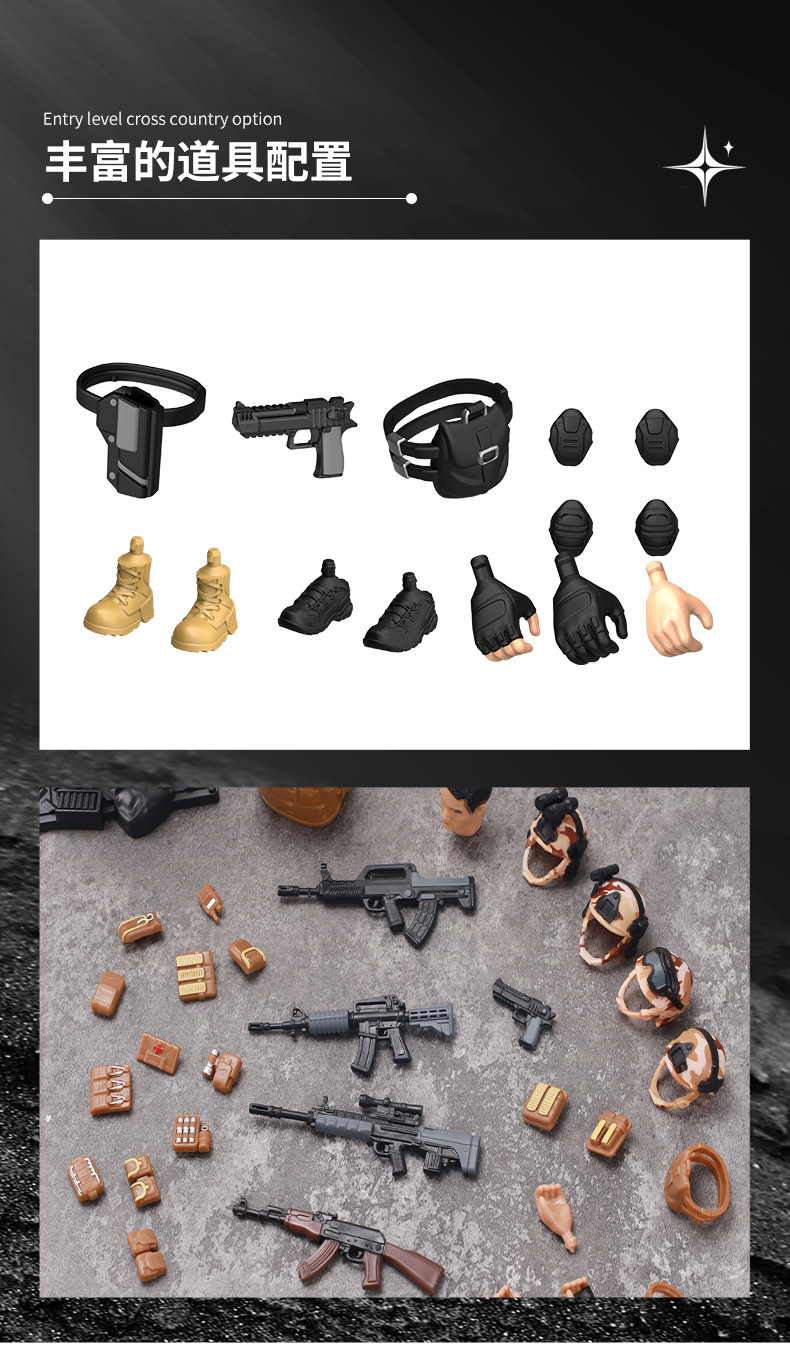 | Características del modelo de soldados | 15 actividades articulares en todo el cuerpo, 6 tipos de armas, 8 características de la cabeza, 5 tarjetas de conocimiento de armas, 4 armas, 3 manos, 2 botas de guerra. |