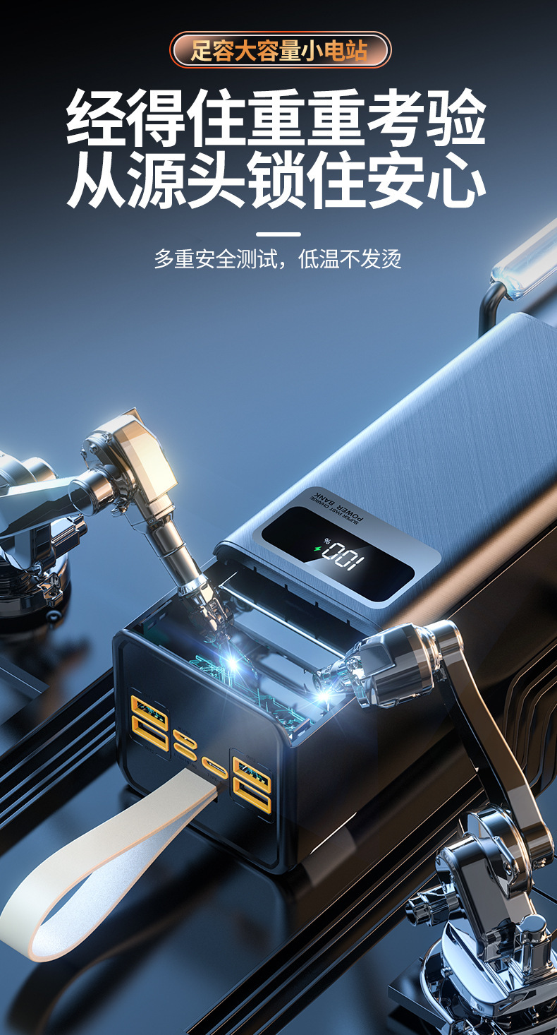 | Función | Pequeño y portátil, a prueba de polvo, a prueba de caídas, con hebillas colgantes, con linternas led, multivoltaje, salida de múltiples u, soporte de carga rápida, visualización digital de energía |