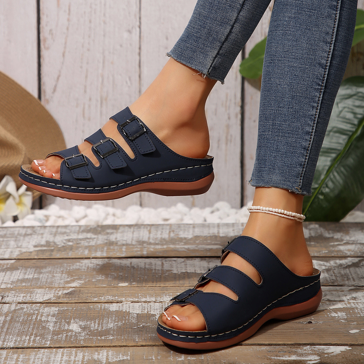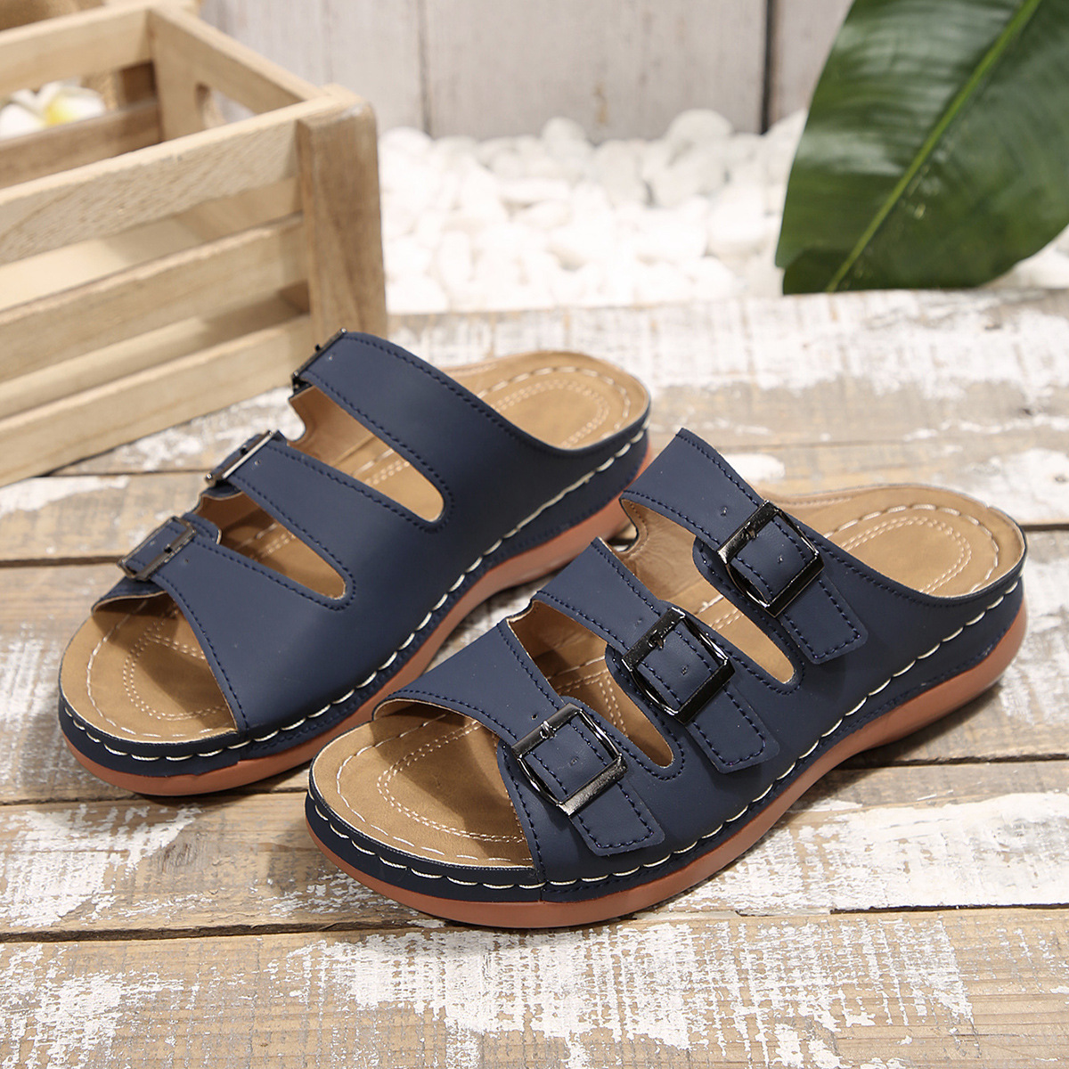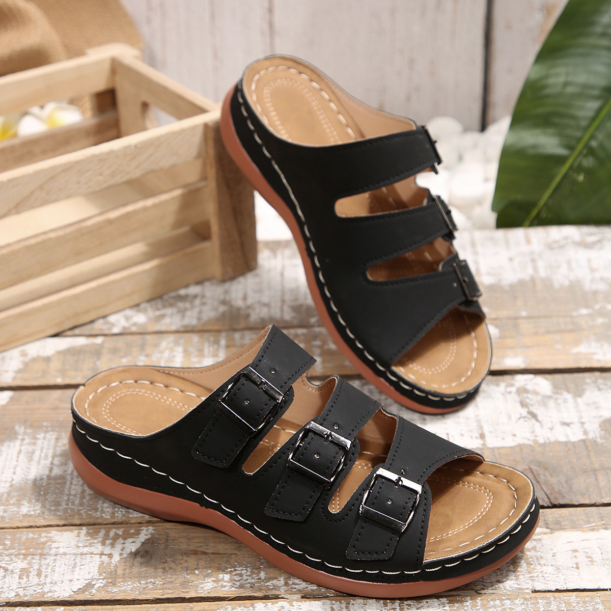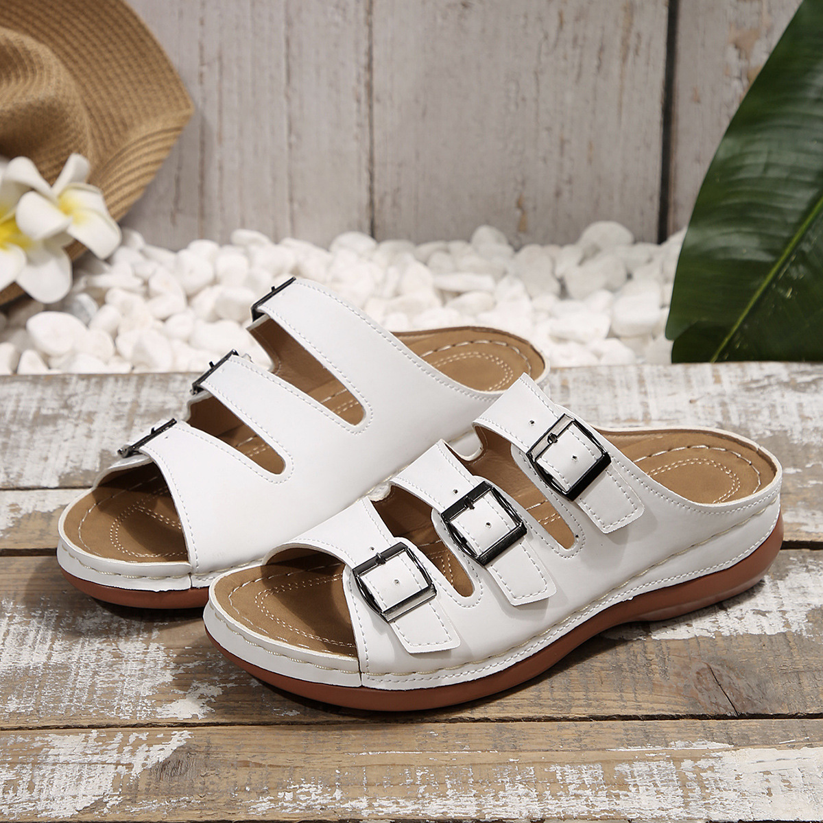 Sandalias de cinturón francés zapatos de mujer 2025 temperamento puntiagudo tacón de cuña salvaje estilo simple de una palabra con sandalias planas de temperamento